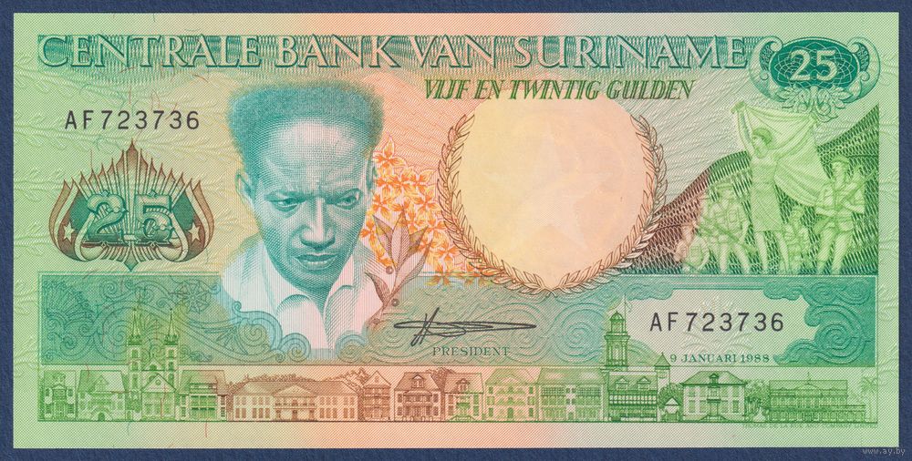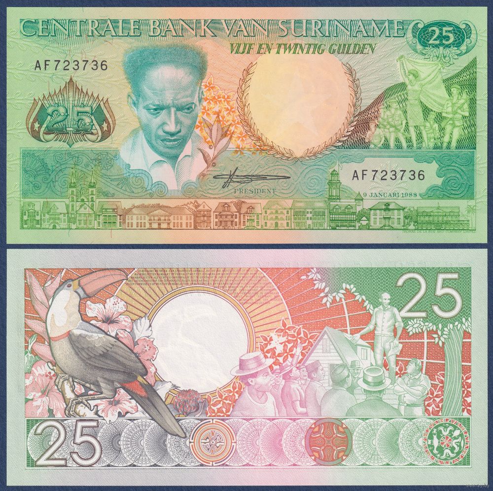Суринам, 25 гульденов 1986 г., P-132b (AF, революционер Антон де Ком, тукан), UNC