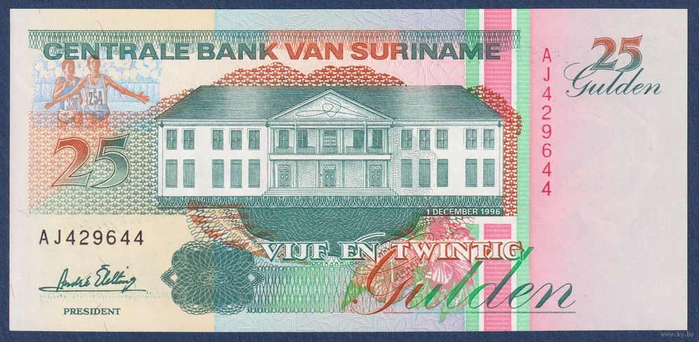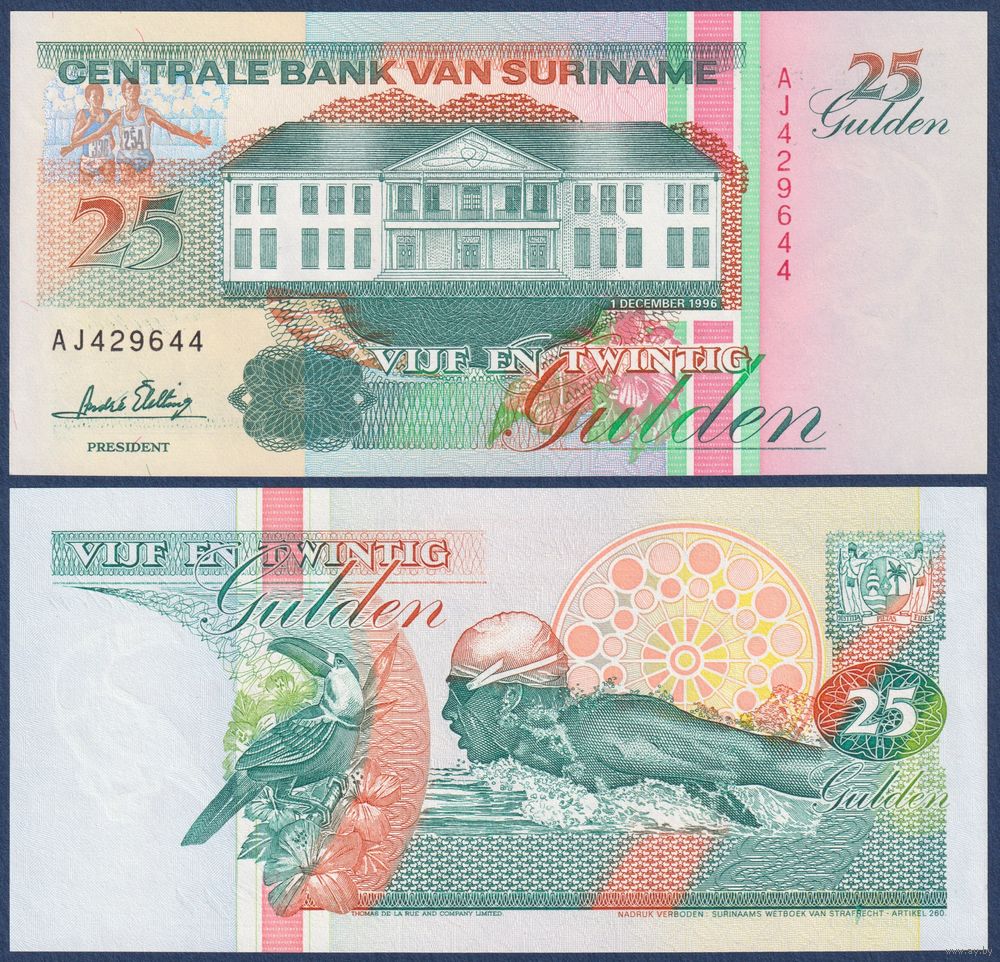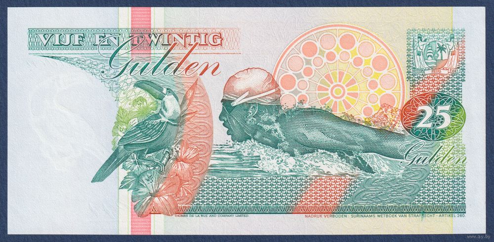 Суринам, 25 гульденов 1996 г., P-138c (AJ, тукан, олимпийский пловец Энтони Несте), UNC