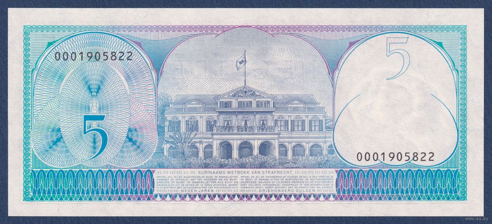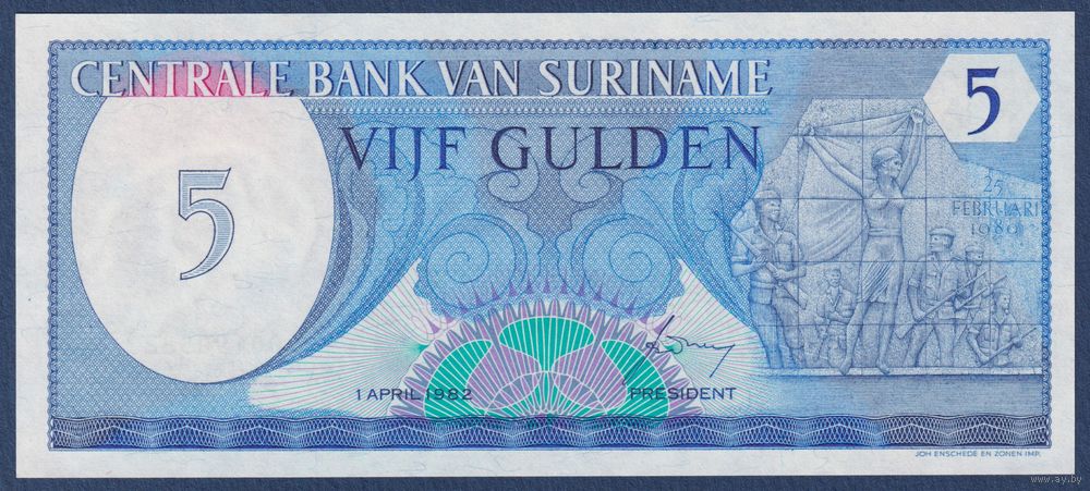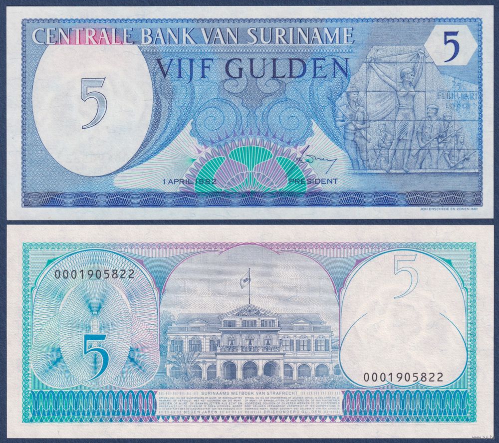 Суринам, 5 гульденов 1982 г., P-125 (памятник восстанию,президентский дворец в Парамарибо), UNC