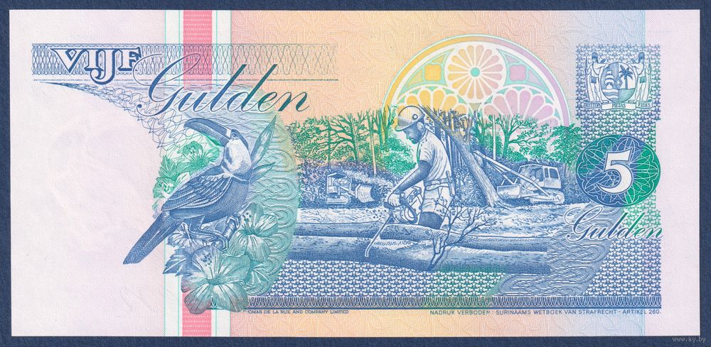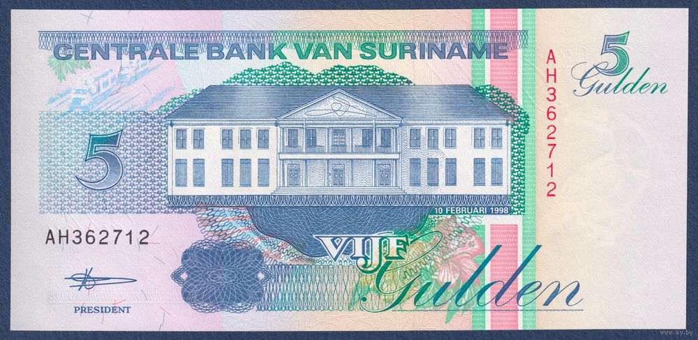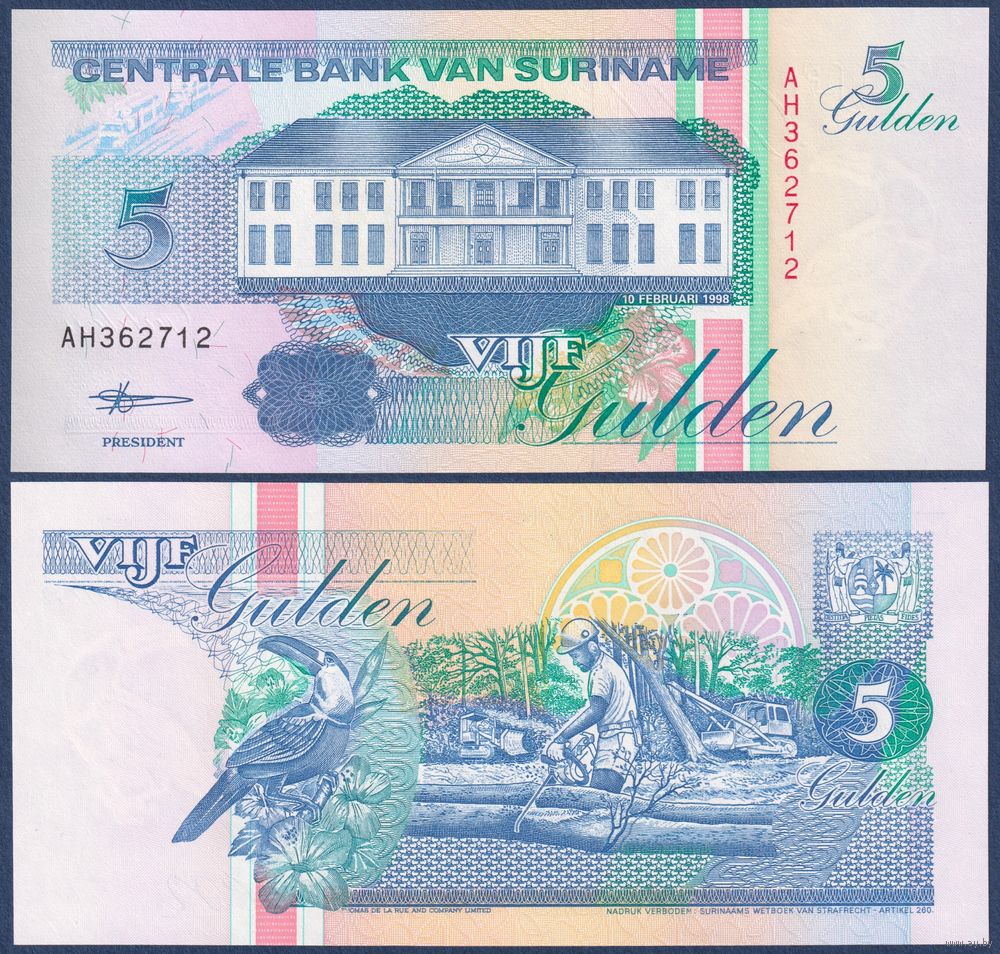 Суринам, 5 гульденов 1998 г., P-136b (AH, центробанк в Парамарибо, тукан), UNC