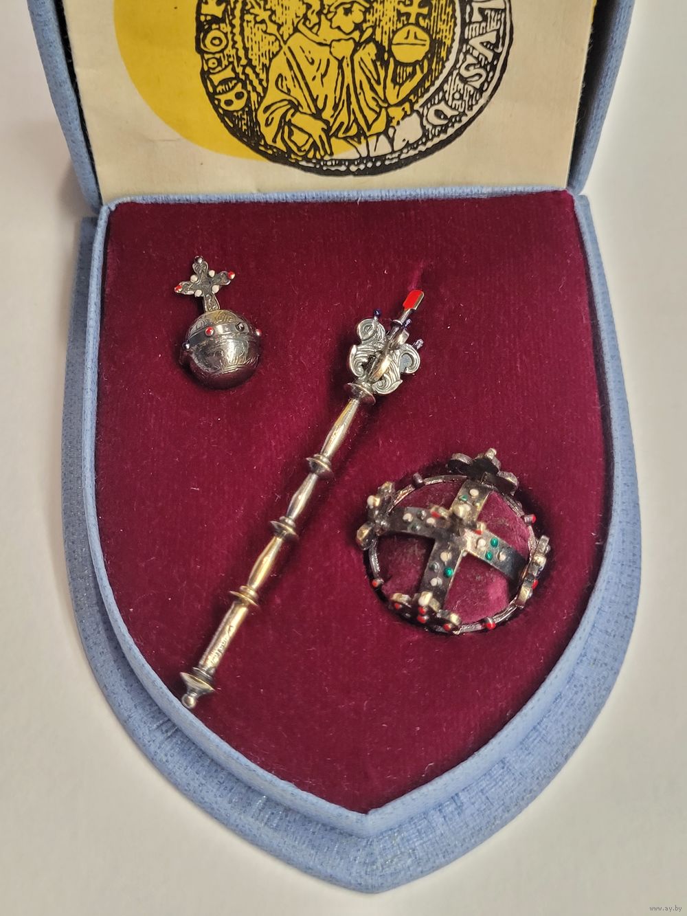 Миниатюры из серебра с позолотой. Скипетр, Корона, Держава. Прилагается описание на четырех языках. Производитель SOLUNA, Чехия, 60-е годы.