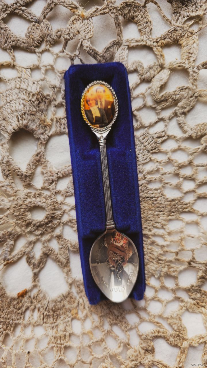 Посеребренная чайная ложка, посвященная свадьбе Чарльза и Дианы 1981 года. Винтажный коллекционный предмет. На ложке изображены принц Чарльз и леди Диана Спенсер. Подходит для поклонников королевской семьи и коллекционеров исторических памятных вещей.