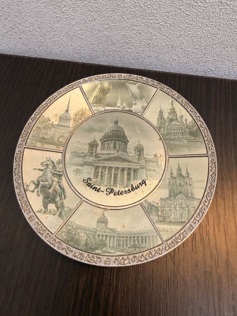 Сувенирная декоративная тарелка с изображением достопримечательностей Санкт-Петербурга.
