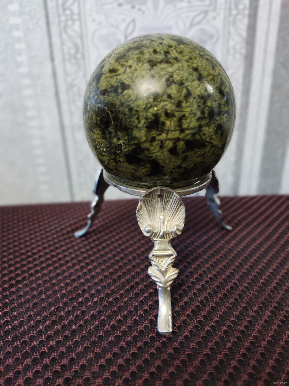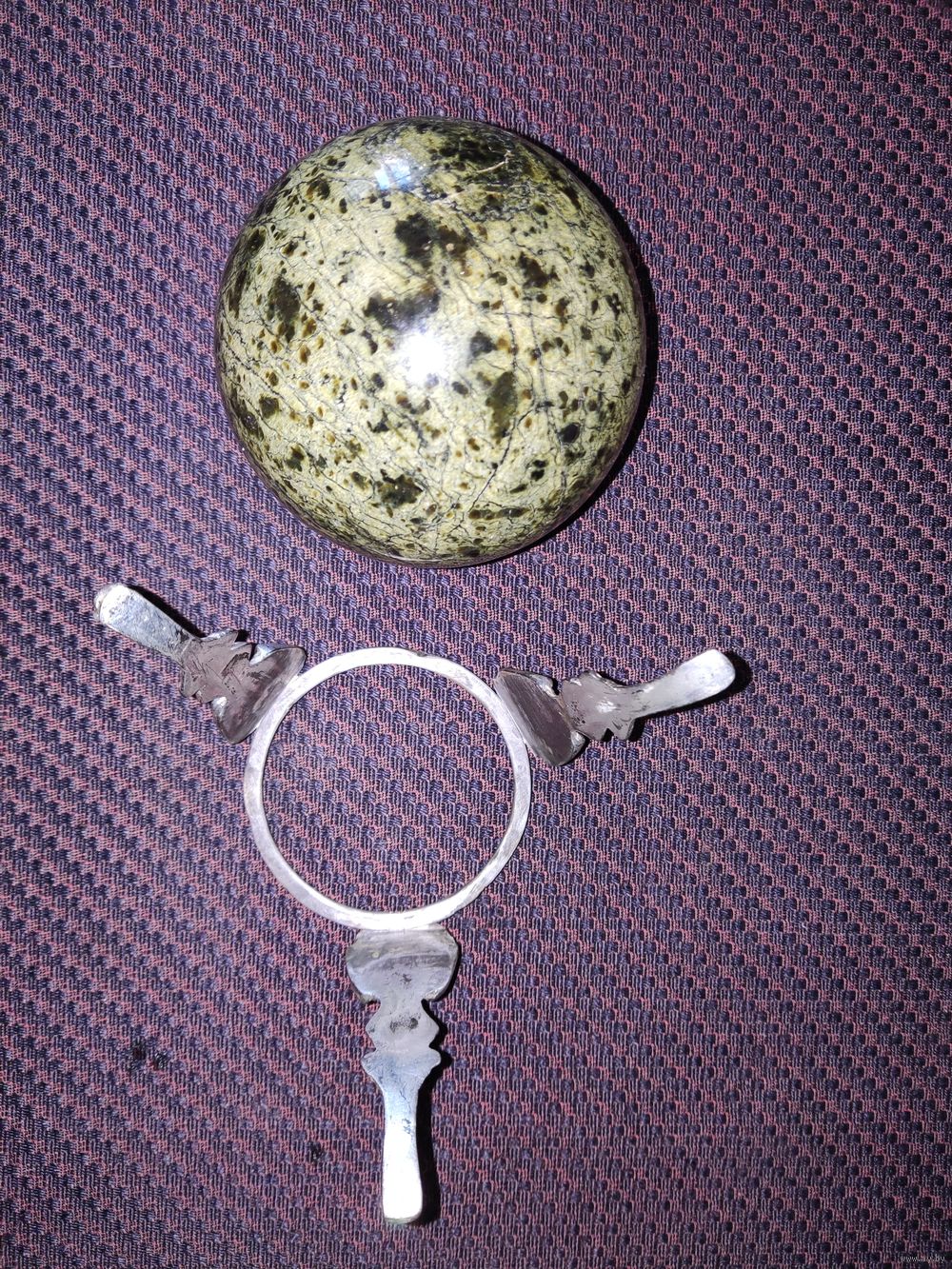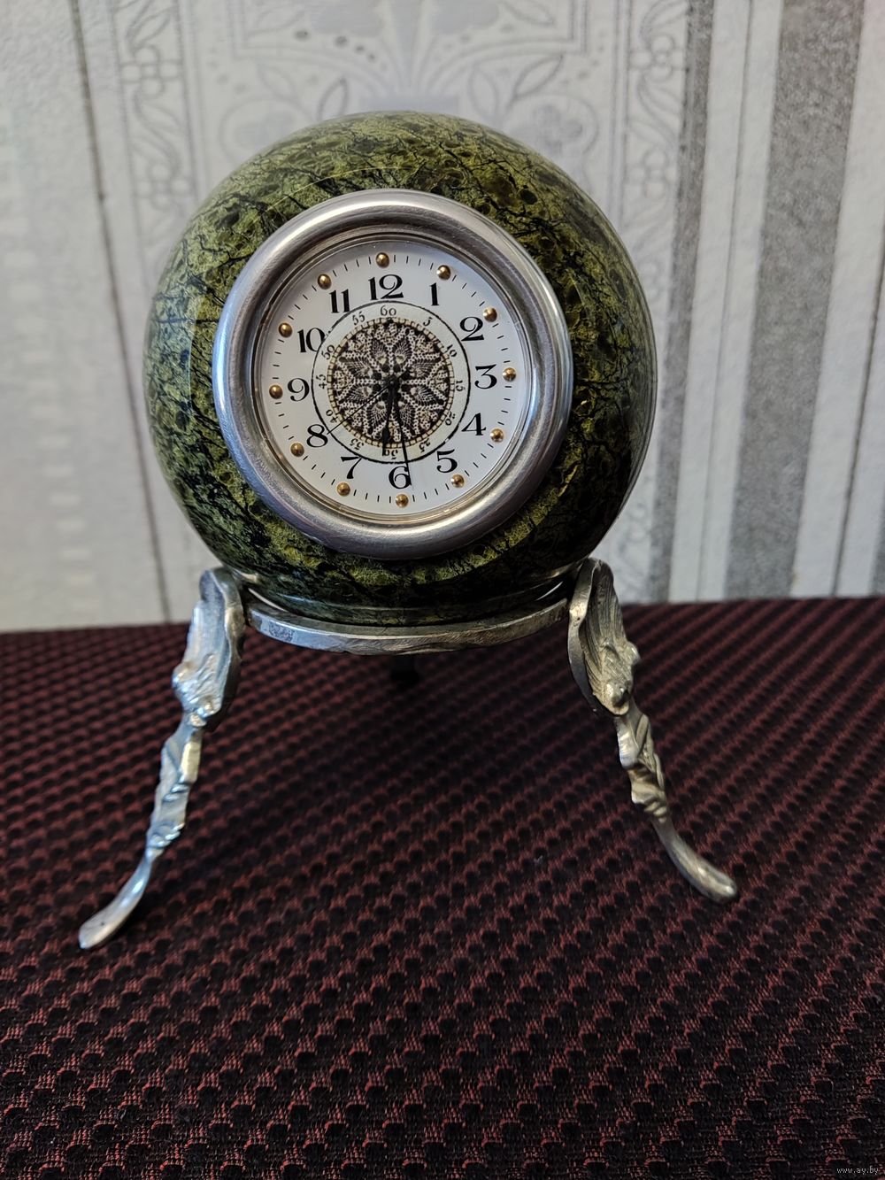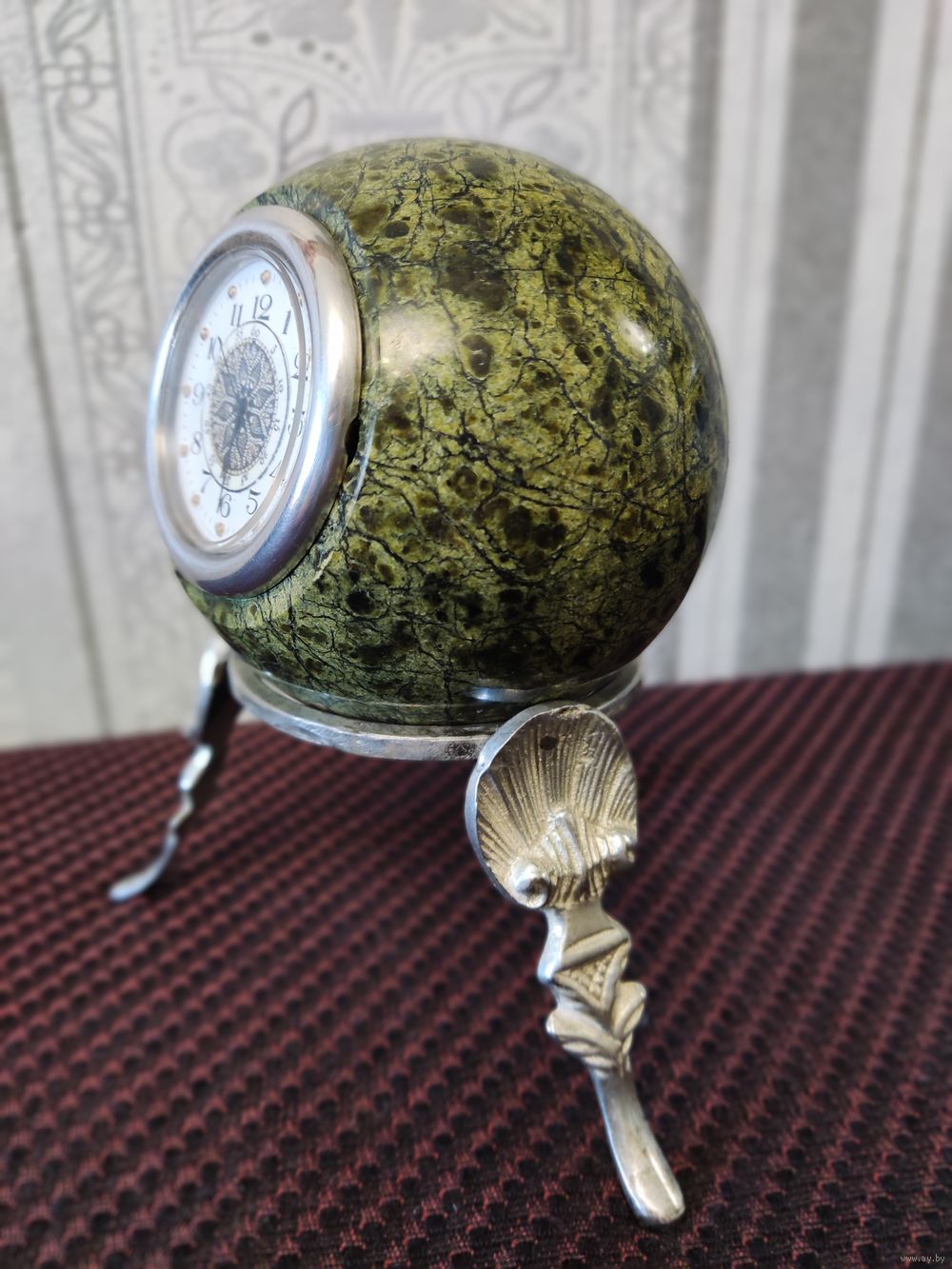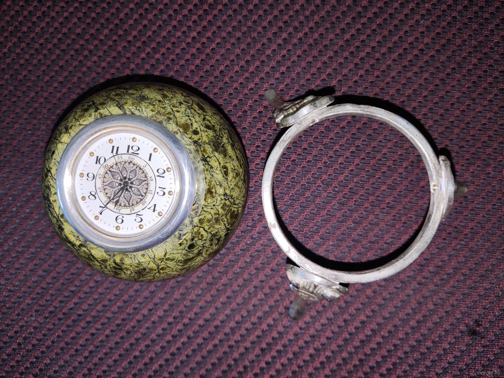 · Сувенирные часы "Шар Антистресс" рабочие, камень змеевик, размеры: 9,5х9,5х15 см. Немного б/у. · Камень Змеевик. Месторождение Южно-Шабровское, Свердловская область, Россия · Материал подставки - бронза/латунь с серебрением · Цвет – натуральный - зеленый, серебро · Размеры: длина 9.5 см, ширина 9.5 см, высота (с подставкой) - 15 см; подставка 12,5 х 12,5 х 7 см. · Часы кварцевые, интересный циферблат, диаметр 5,4 см, батарейка 626. · Вес шара с часами - 980 г; вес подставки - 110 г. · Назначение - для интерьера, для медитаций · Тип сувенира - Антистресс, настольные · Форма - круглое · Тип изделия - Часы настольные, шар · Страна изготовитель – Россия, «Уральский сувенир». · Комплектация: Шар-часы 1 шт. Подставка под шар 1 шт.