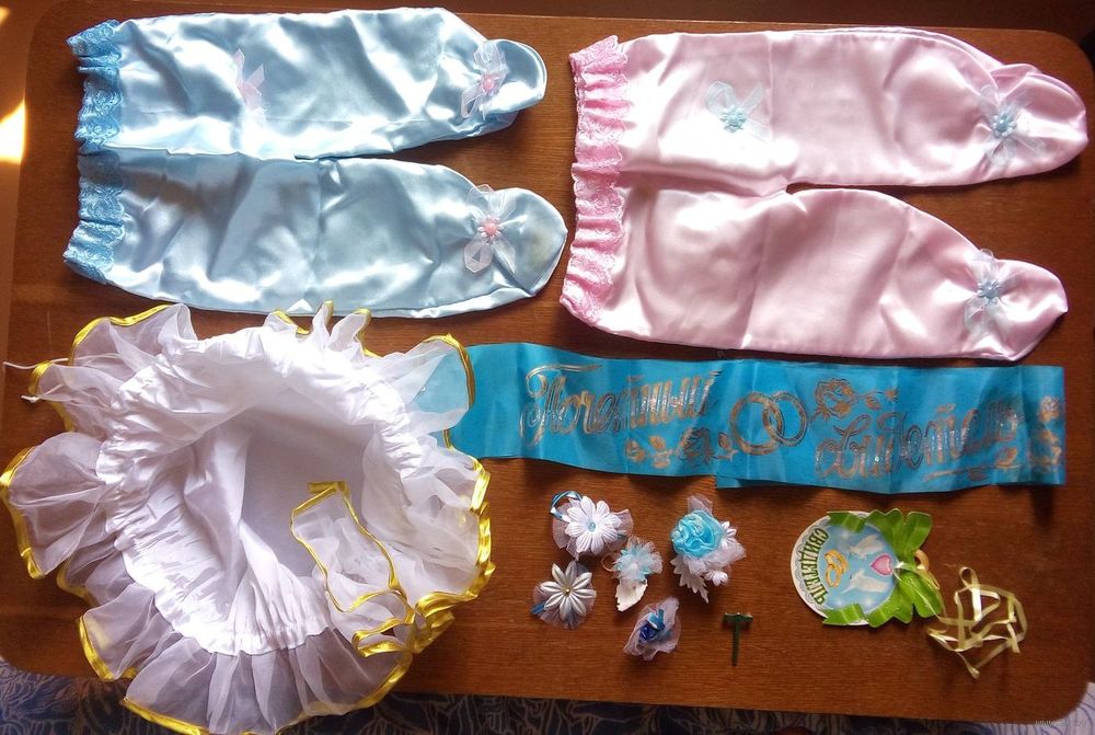 Свадебный набор свидетеля. Использовался один раз. В наборе: ползунки для сбора денег розовые и голубые, лента "почётный свидетель" и бумажная медалька свидетеля, бутоньерки и мешочек для всего этого на шнуровке. Лента "почётный свидетель" была облита чем-то вкусным, есть пятна (полная длина 1.8м).Бумажная медалька свидетеля была сложена пополам. Розовые ползунки "в огне". В голубых ползунках низ правого носочка пострадал вместе с лентой "почётного свидетеля", есть пятно. Бутоньерки вешать можно. Мешочек в идеале. Размеры ползунков на фото №4,6. Диаметр мешочка до 35см, глубина до 12см