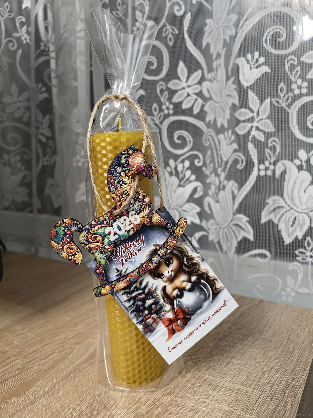 Подарочная свеча из натуральной вощины- оригинальный подарок для себя или своих близких. высота свечи 19,5 см, диаметр 4,5 см. Свеча упакована в плотный прозрачный пакет завязанный джутовым шпагатом с открыткой и деревянной лошадкой.