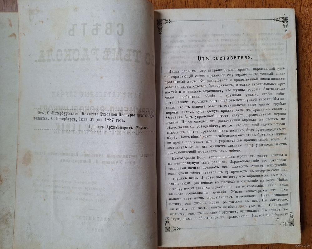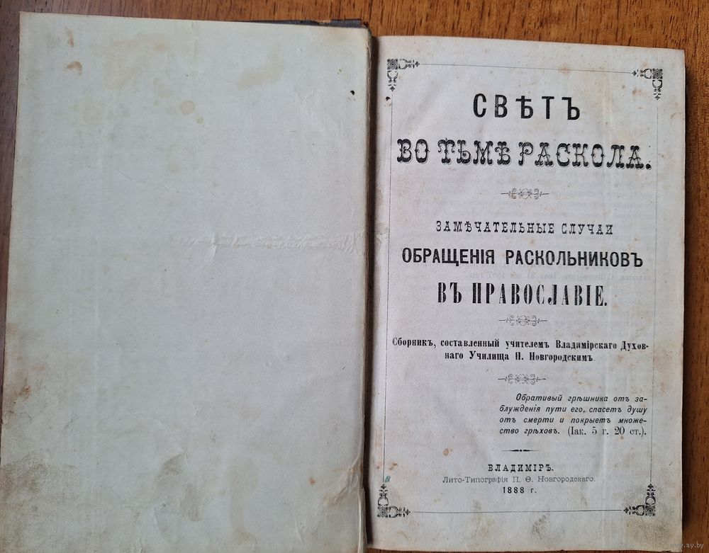 "Свет во тьме раскола : Замечательные случаи обращения раскольников в православие"... : Сборник/ сост. учителем Владимирского духовного уч-ща П. Ф. Новгородским . - Владимир : Лито-тип. П. Ф. Новгородского , 1888- . - 22 см. 300 стр. Страницы все. Лисьи пятна, незначительно. Без печатей, штампов, помет.
