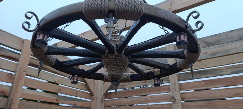 Шикарный светильник из старинного дубового колеса для беседки,терассы,усадьбы,бани и т.д..(в наличии два одинаковых), диаметр 90см, брошюровка покрыта лаком,обод эффект молота -цвет меди с напылением серебра,ретро-патроны бронза, цепи покрыты цветом полисандр, канат 10мм, проводка сделана на двойной выключатель (центр одна лампа,четыре по бокам), присутствуют элементы кованки.