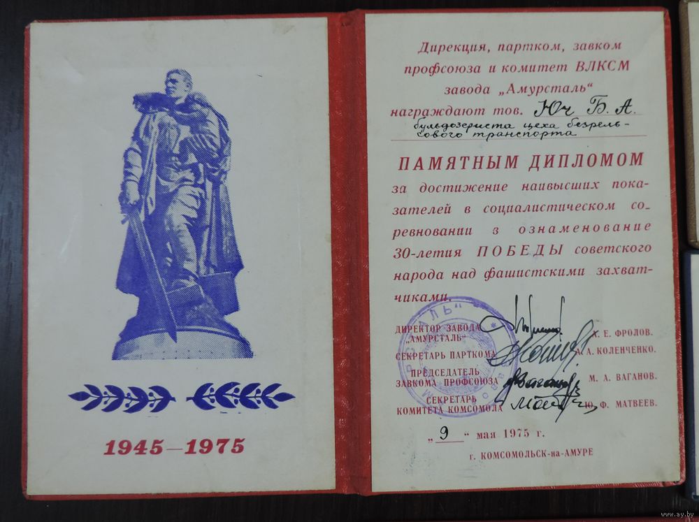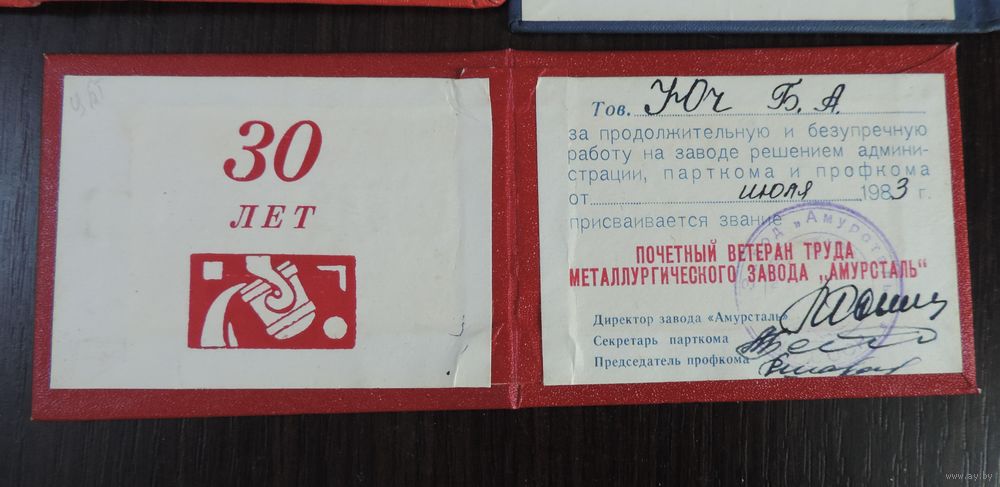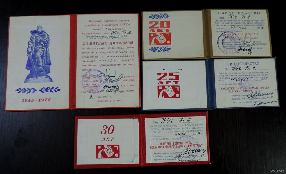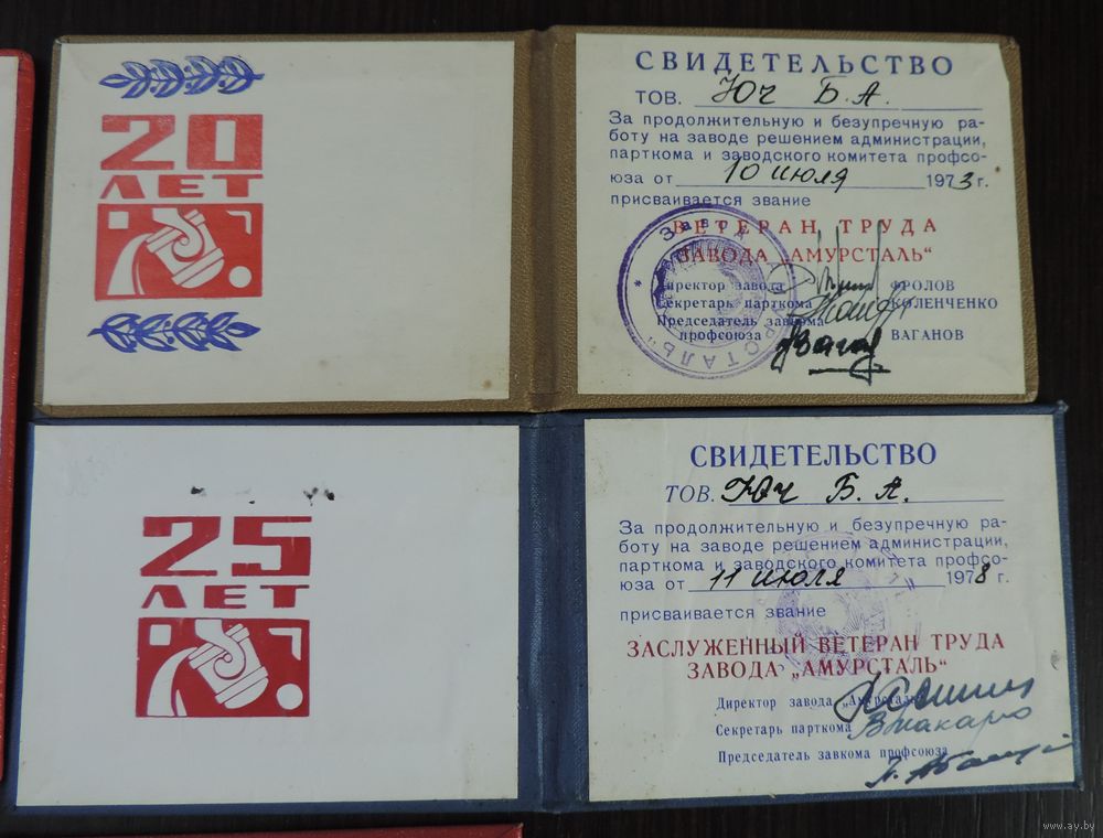 Свидетельства ветерана труда 3 шт и памятный диплом за вода "Амурсталь" 1973-1983г. 4 шт.