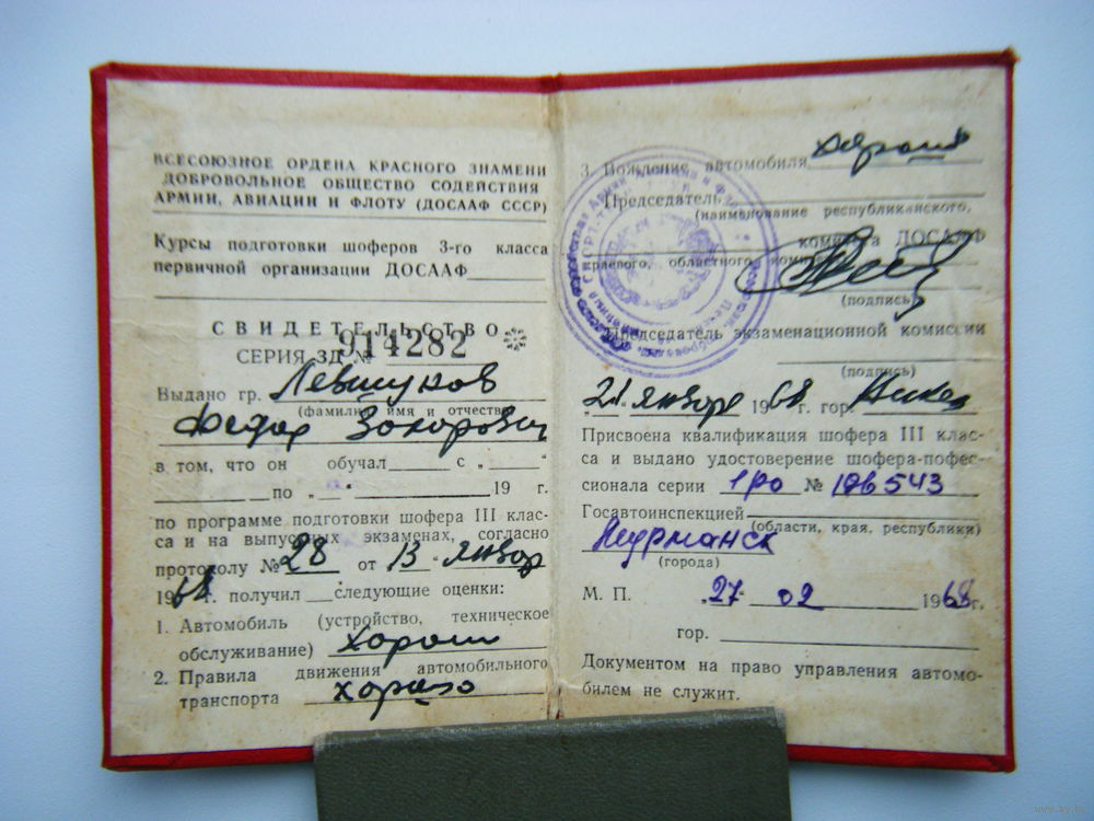 СВИДЕТЕЛЬСТВО ДОСААФ 1968г. СССР.