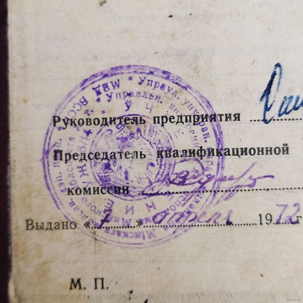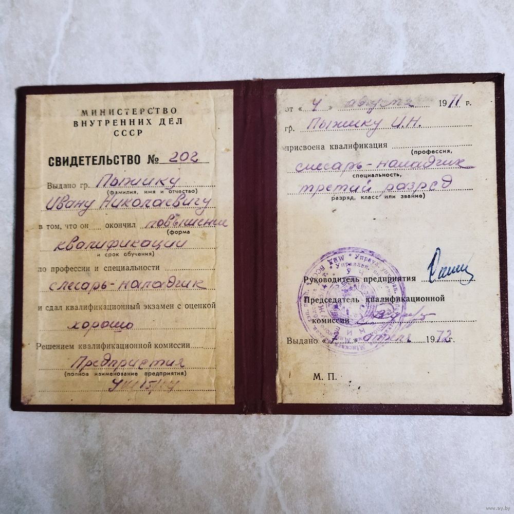 Свидетельство. МВД СССР. Повышение квалификации. Выдано в местах лишения свободы. УЖ 15/14. 1971 год.