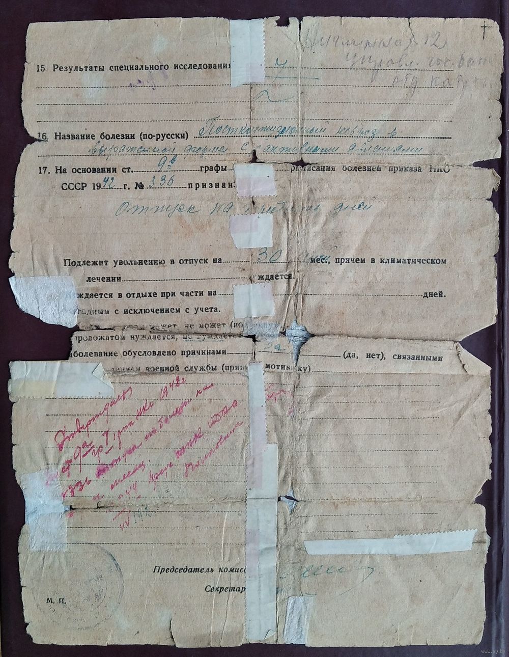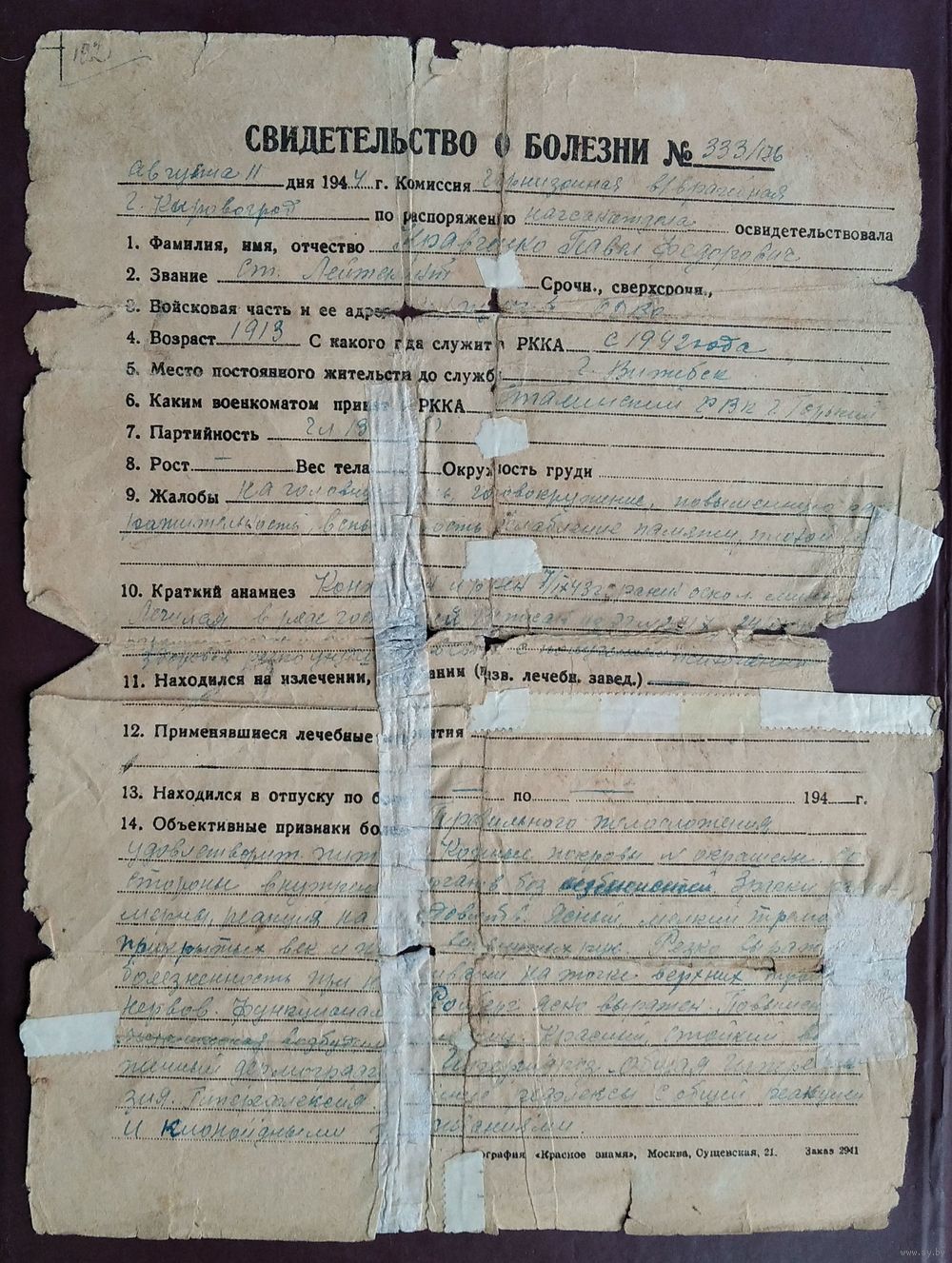 Свидетельство о болезни. Август 1944 г.
