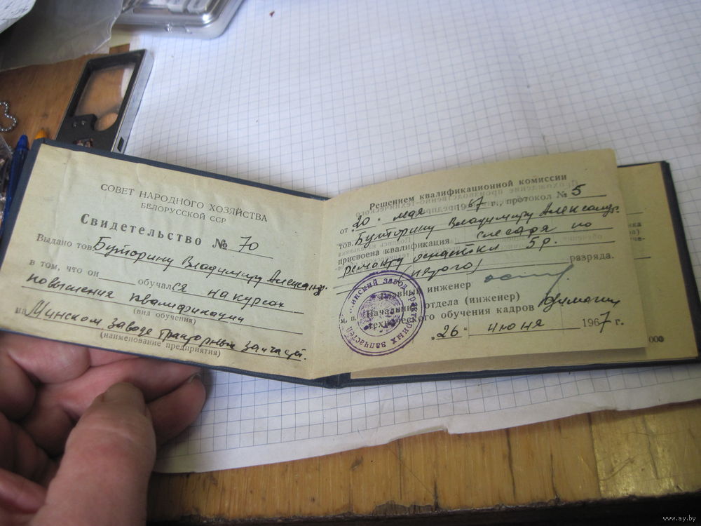 Свидетельство о повышении квалификации на Минском заводе тракторных запчастей 1967 г с рубля!