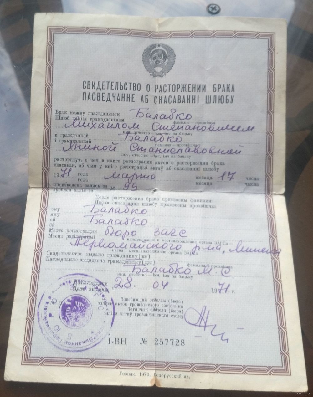 Свидетельство о расторжении брака 1971 год