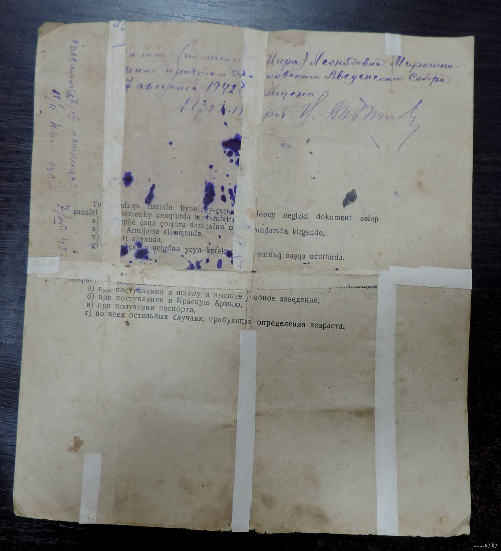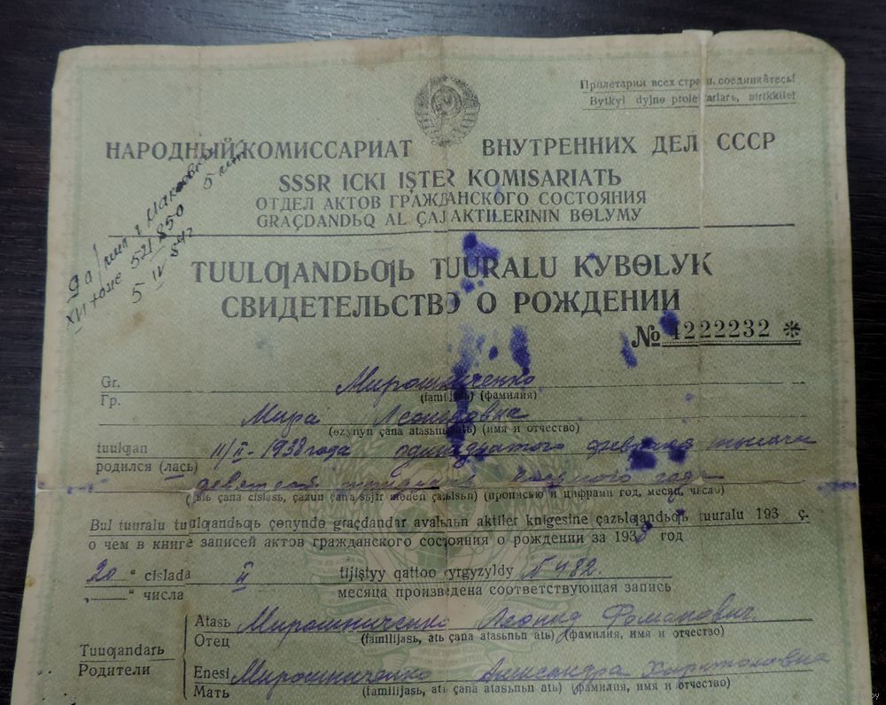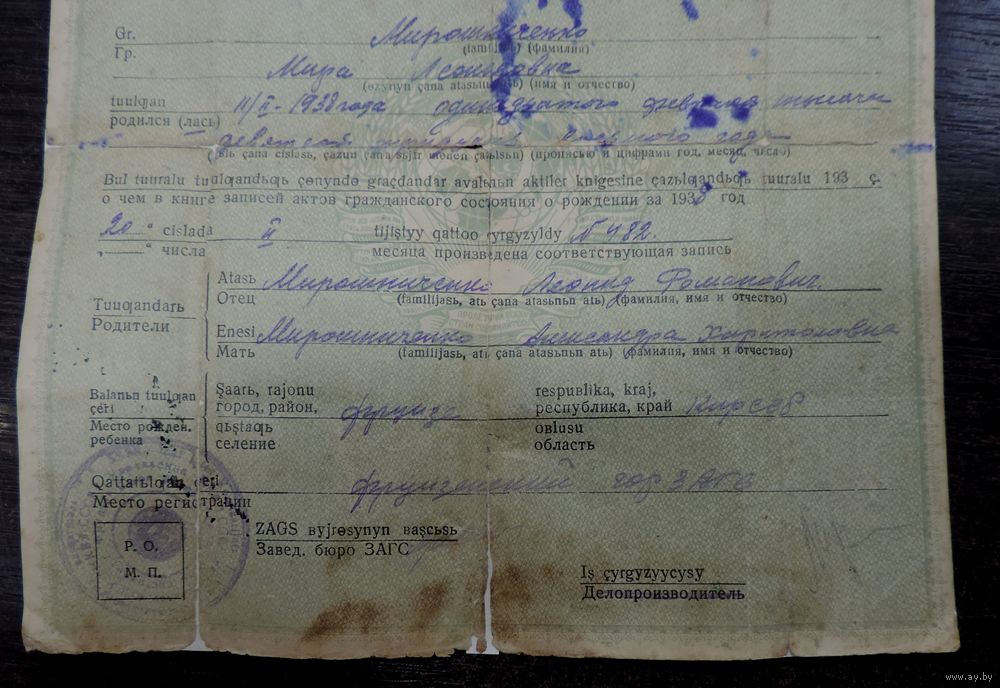 Свидетельство о рождении 1938 г. Кирг. ССР. Размер документа 20-23 см.