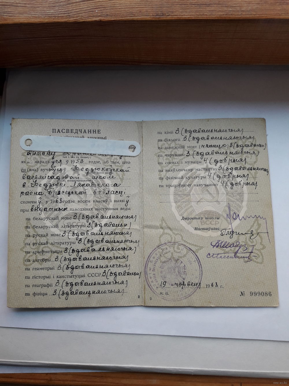 Свидетельство о восьмилетнем образовании Мин. просвещения БССР гознак 1968