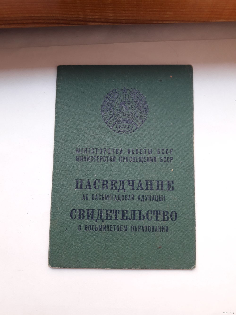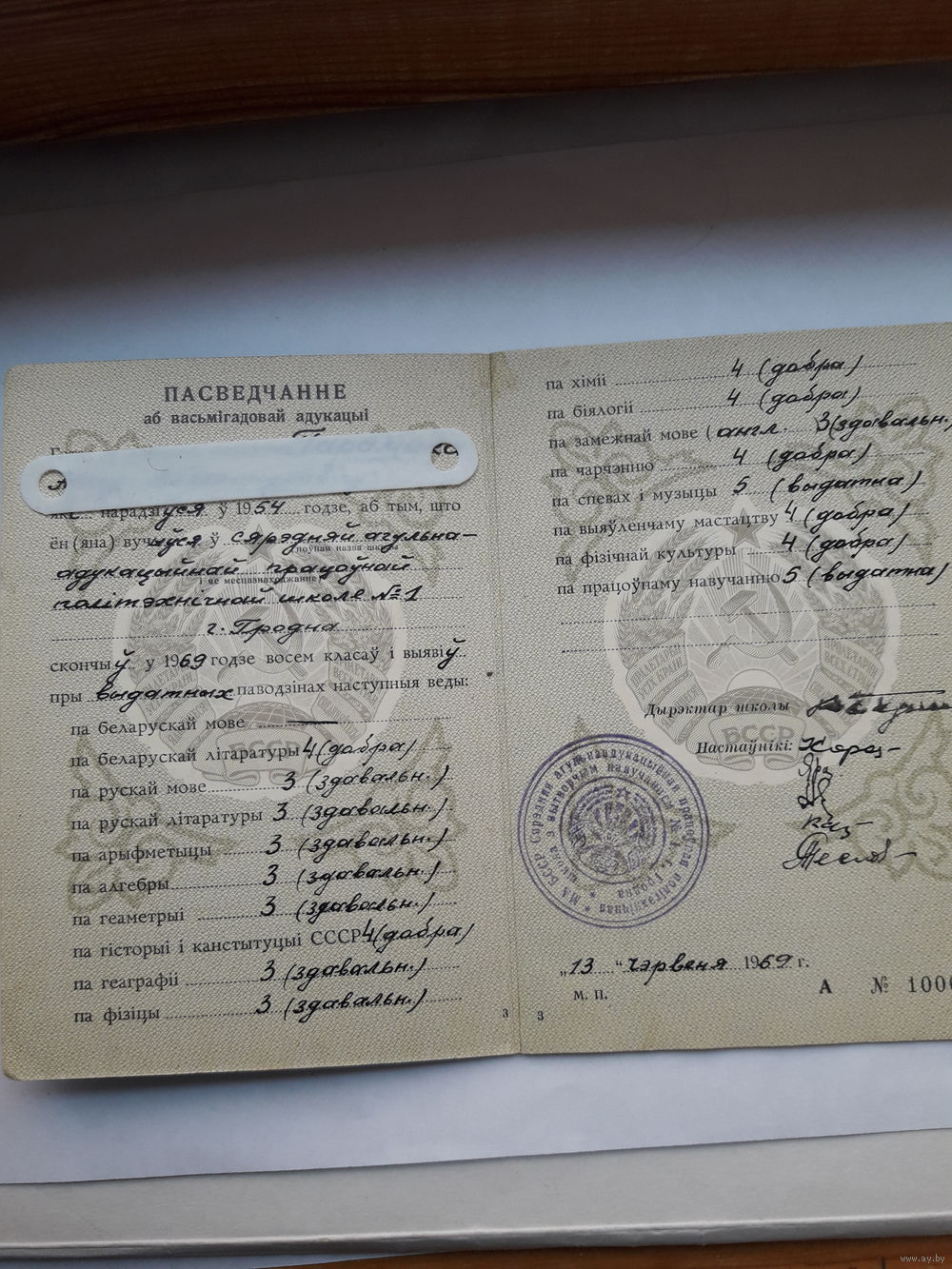 Свидетельство о восьмилетнем образовании Мин. просвещения БССР гознак 1969