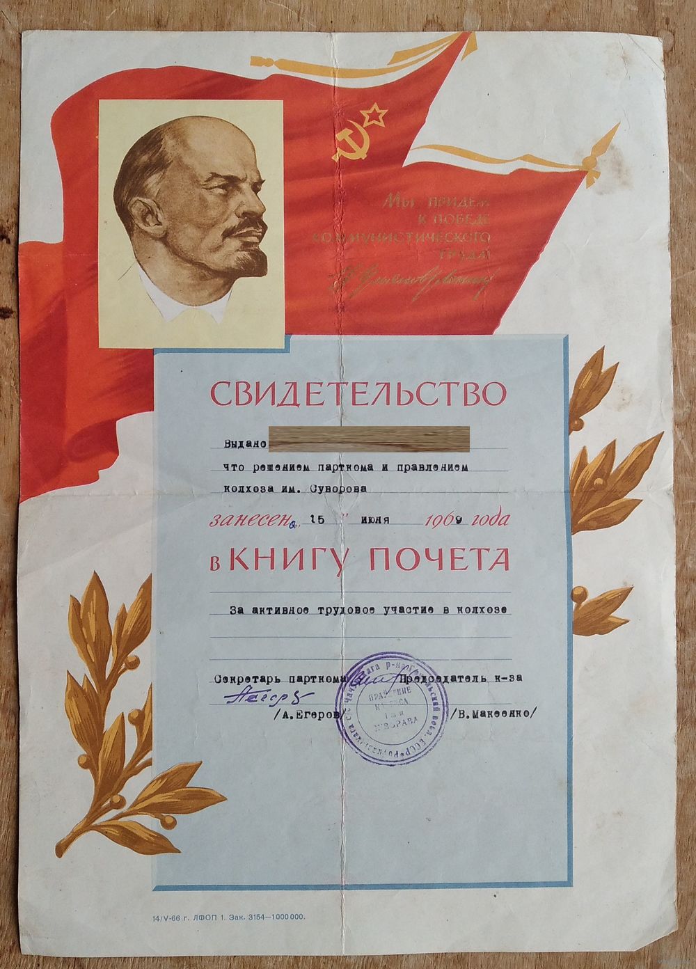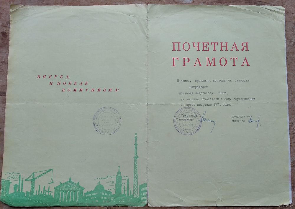 Свидетельство о занесении в Книгу Почета + две Почетные грамоты на одно лицо. 1969- 1971 г г. Колхоз Суворова. Чечерский р-н.Цена за все