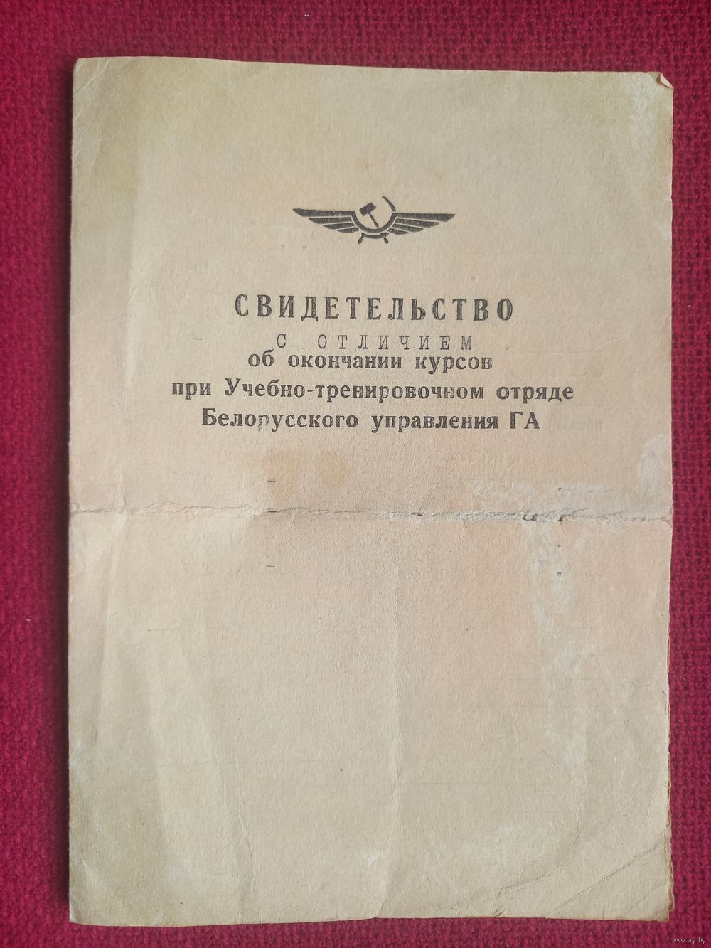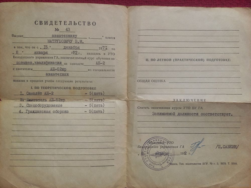 Свидетельство об окончание курсов Белорусского управления Гражданской авиации