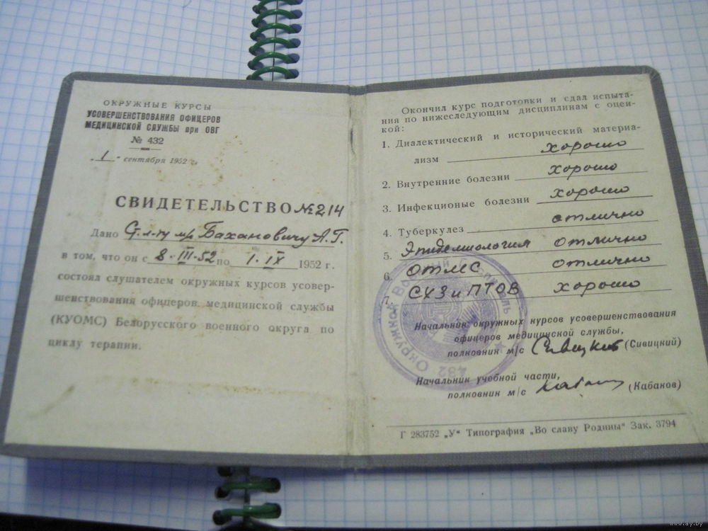 Свидетельство об окончании курсов усовершенствования офицеров медслужбы БВО 1952 г. Торги!