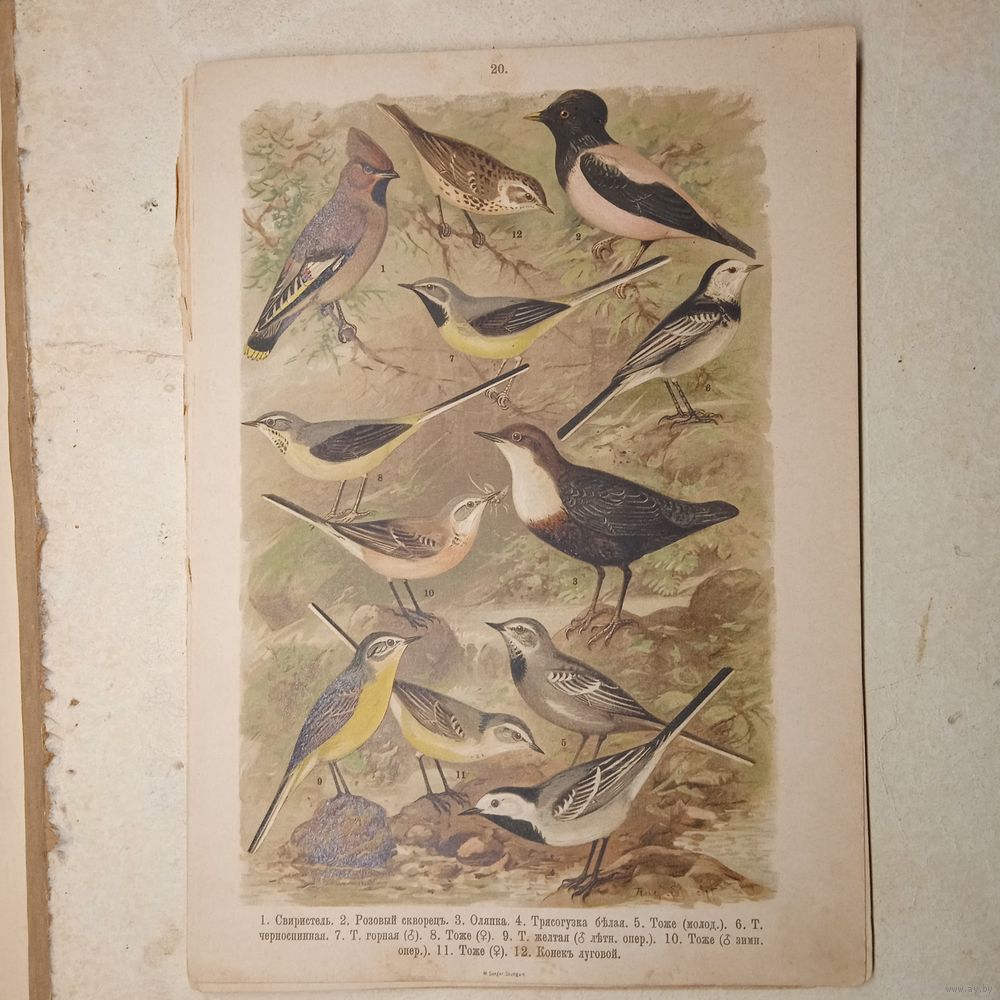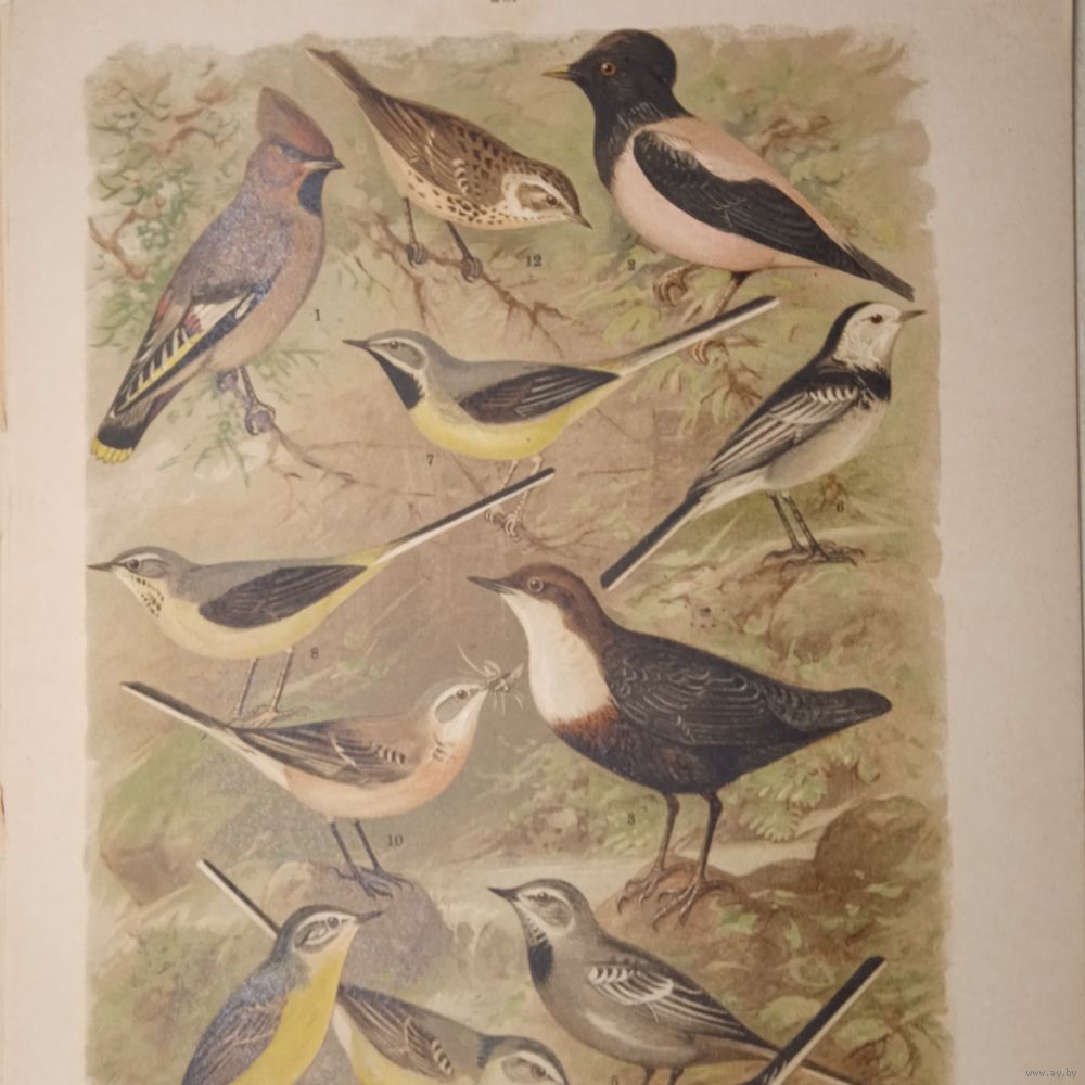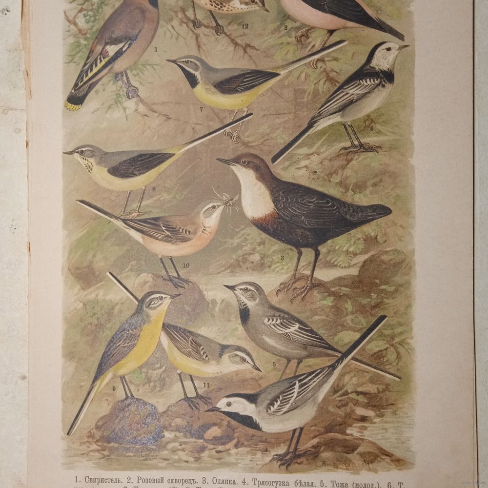 СВИРИСТЕЛЬ РОЗОВЫЙ СКВОРЕЦ ТРЯСОГУСКА КОНЕК. ХРОМОЛИТОГРАФИЯ ПТИЦЫ. Энциклопедическая гравюра конец 19века 29х21см.