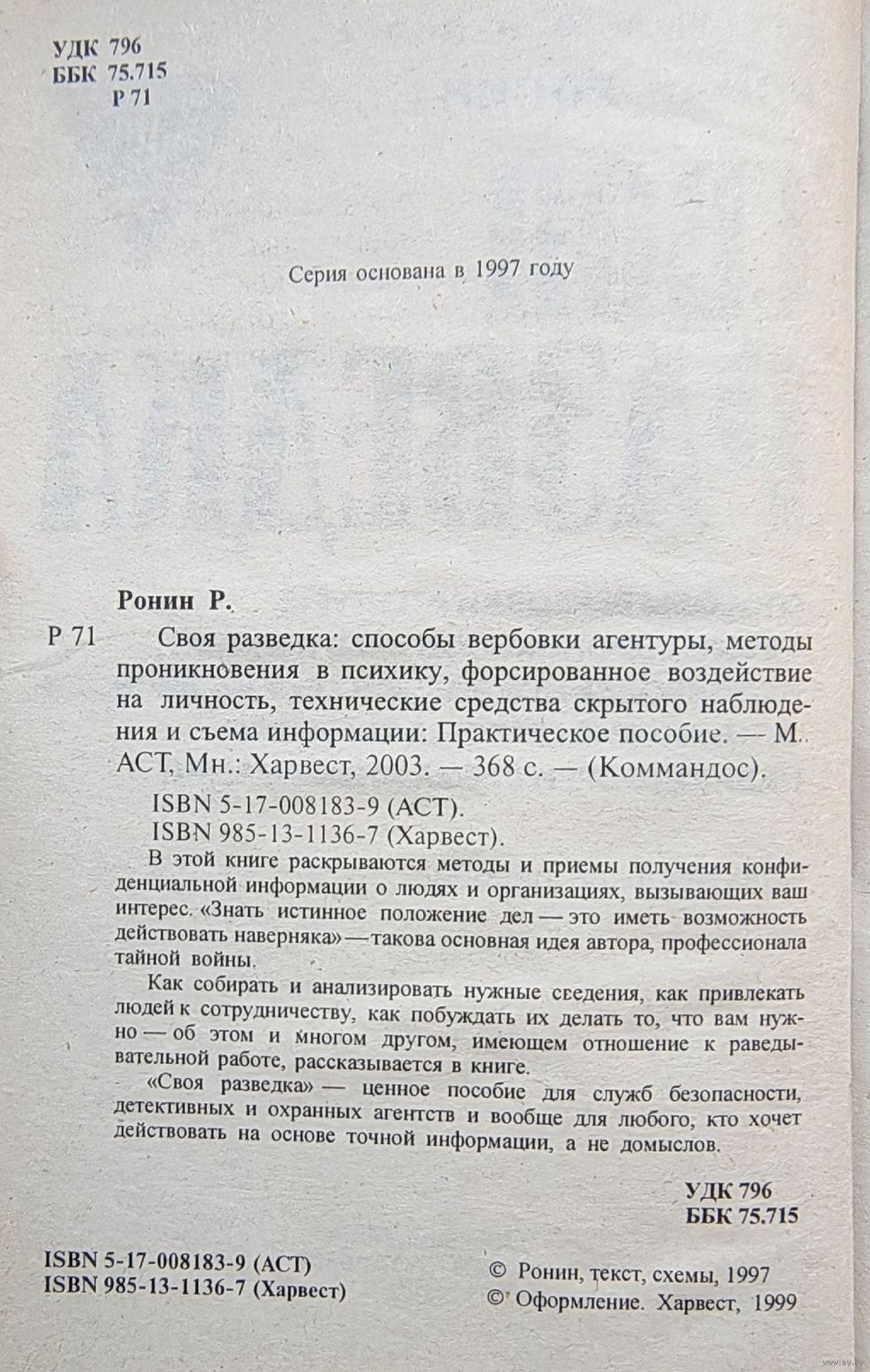 В этой книге раскрываются методы и приемы получения конфиденциальной информации о людях и организациях, вызывающих ваш интерес. «Знать истинное положение дел – это иметь возможность действовать наверняка», такова основная идея автора, профессионала тайной войны. Как получать и анализировать нужные сведения, как привлекать людей к сотрудничеству, как побуждать их делать то, что вам нужно – об этом и многом другом рассказывается в этой книге.
