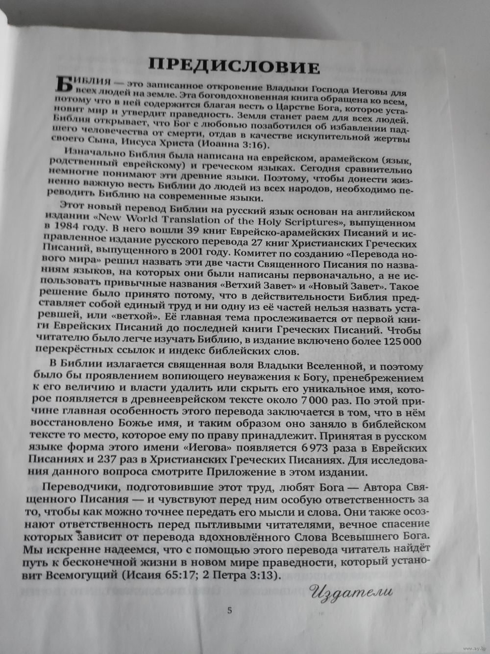В Библии излагается священная воля Владыки Вселенной, и поэтому было бы проявлением вопиющего неуважения к Богу, пренебрежением к его величию и власти удалить или скрыть его уникальное имя, которое появляется в древнееврейском тексте около 7 ООО раз. По этой причине главная особенность этого перевода заключается в том, что в нем восстановлено Божье имя, и таким образом оно заняло в библейском тексте то место, которое ему по праву принадлежит. Принятая в русском языке форма этого имени "Иегова" появляется 6 973 раза в Еврейских Писаниях и 237 раз в Христианских Греческих Писаниях. Для исследования данного вопроса смотрите Приложение в этом издании.