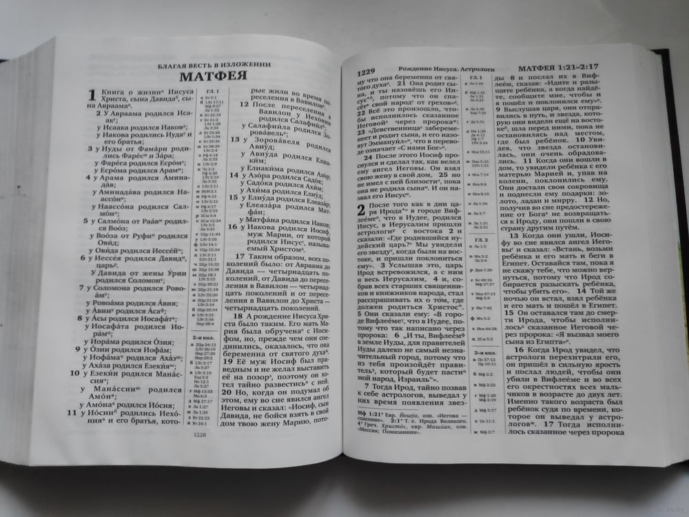 Этот новый перевод Библии на русский язык основан на английском издании "New World Translation of the Holy Scriptures", выпущенном в 1984 году. В него вошли 39 книг Еврейско-арамейских Писаний и исправленное издание русского перевода 27 книг Христианских Греческих Писаний, выпущенного в 2001 году. Комитет по созданию "Перевода нового мира" решил назвать эти две части Священного Писания по названиям языков, на которых они были написаны первоначально, а не использовать привычные названия "Ветхий Завет" и "Новый Завет". Такое решение было принято потому, что в действительности Библия представляет собой единый труд и ни одну из ее частей нельзя назвать устаревшей, или "ветхой". Ее главная тема прослеживается от первой книги Еврейских Писаний до последней книги Греческих Писаний. Чтобы читателю было легче изучать Библию, в издание включено более 125 ООО перекрестных ссылок и индекс библейских слов.