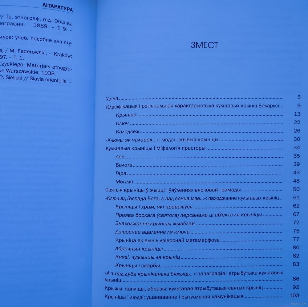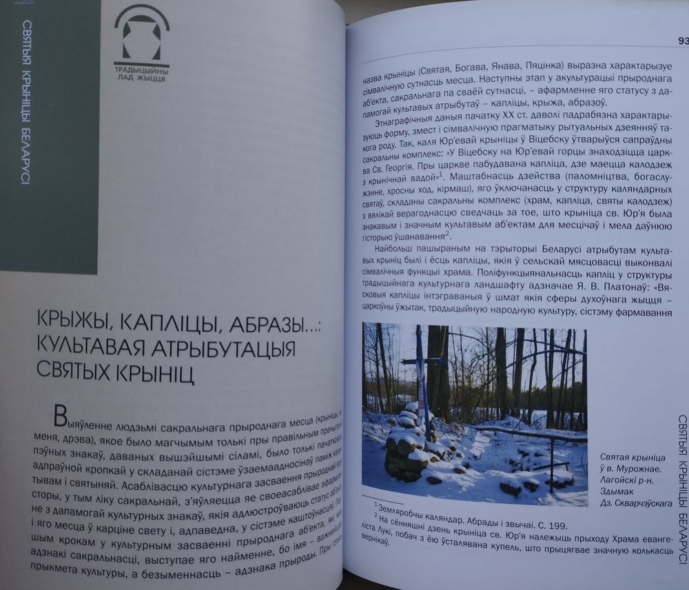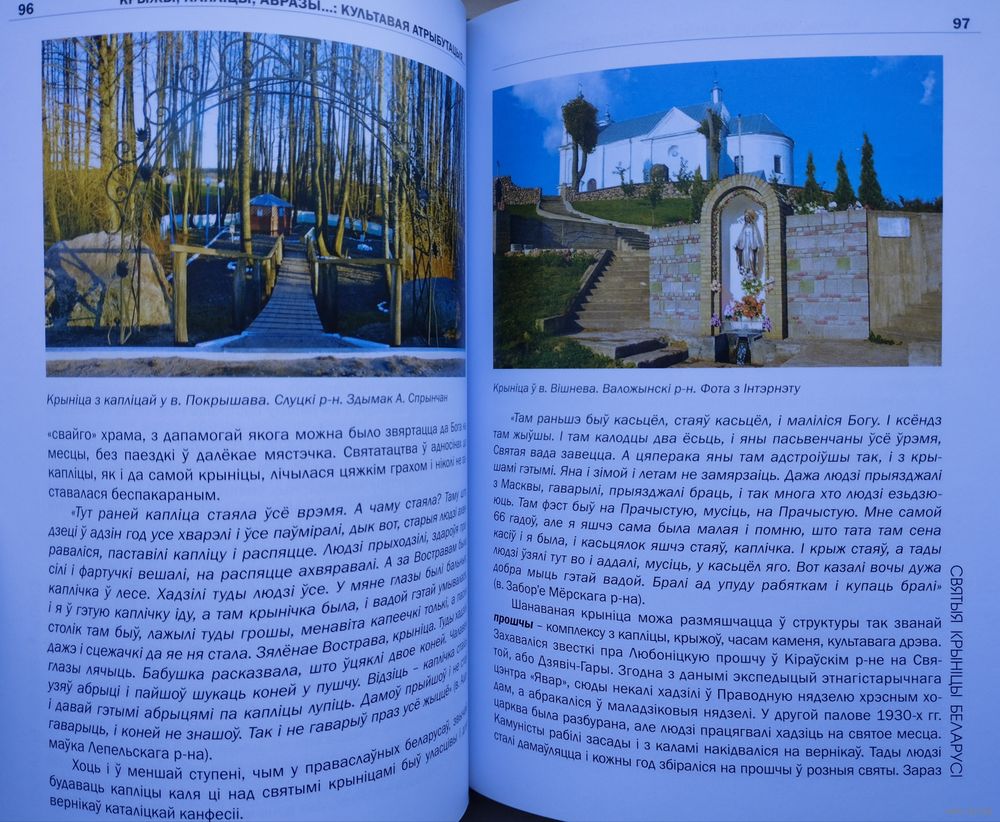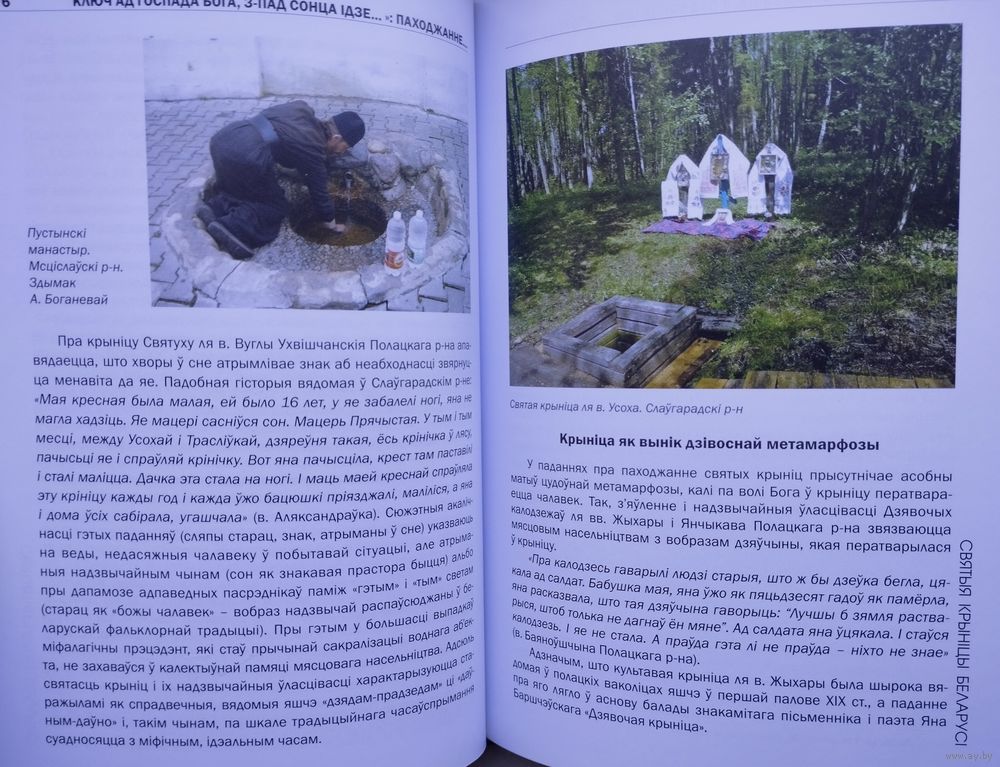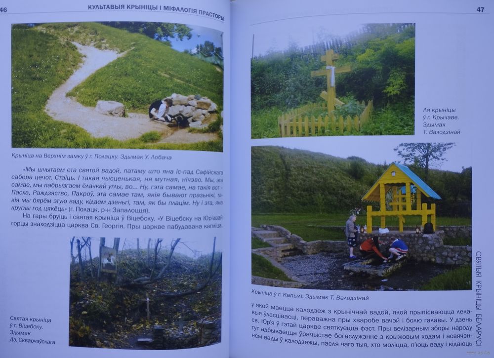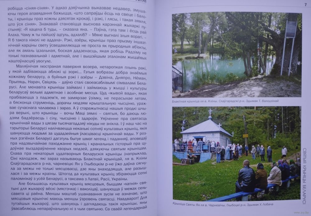 Вялікі фармат. Крэйдаваны альбом. Тыраж 700 экз. 392 стар. Кніга "Святыя крыніцы Беларусі" прысвечана культавым крыніцам, якія лічацца святымі сярод жыхароў нашай краіны. З дапамогай розных неабыякавых да гісторыі сваіх мясцін людзей аўтарамі былі сабраны і апісаны этнакультурныя традыцыі з амаль тысячагадовай гісторыяй, якія шырока распаўсюджаны на беларускіх землях: розныя легенды, паданні, абрады, каляндарныя святы і рытуалы, звязаныя з ушанаваннем святых крыніц. У кнізе змяшчаецца вялікая колькасць экспедыцыйных фальклорна-этнаграфічных матэрыялаў, адметнай рысай якіх з'яўляецца аўтэнтычны стыль, суправаджаных мноствам цікавых гістарычных звестак, спасылак і цытат. Адразу прыцягвае ўвагу выдатная паліграфія са мноствам каляровых здымкаў з розных куткоў нашай краіны, на якіх, магчыма, вам пашанцуе пазнаць ваша роднае мястэчка або вашых суседзяў. І хто ведае, можа так здарыцца, што пасля прачытання ў вас узнікне жаданне адправіцца ў падарожжа да адной з гэтых святых крыніц.
