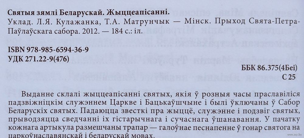 Святыя зямлі Беларускай: жыццеапісанні: да 1020-годдзя Праваслаўнай царквы ў Беларусі.[укладальнікі: Л. Я. Кулажанка, Т. А. Матрунчык. Мінск : Прыход Свята-Петра-Паўлаўскага сабора ў г. Мінску, 2012 г. 183 с. Мяккая вокладка.