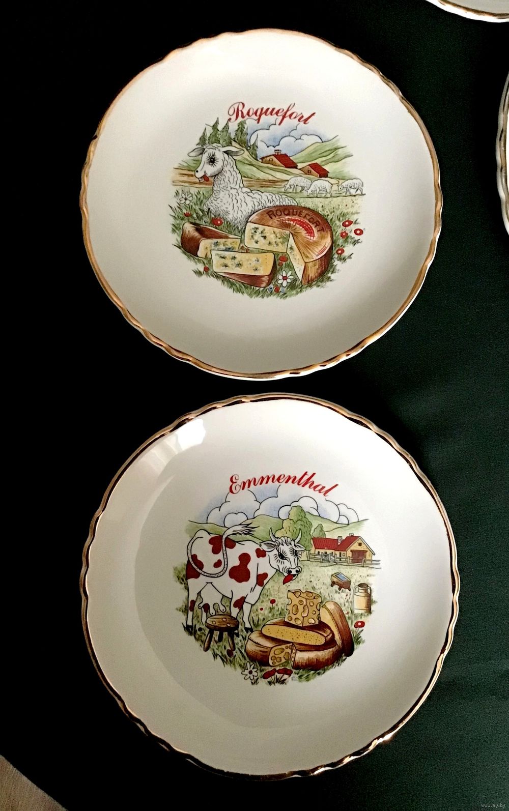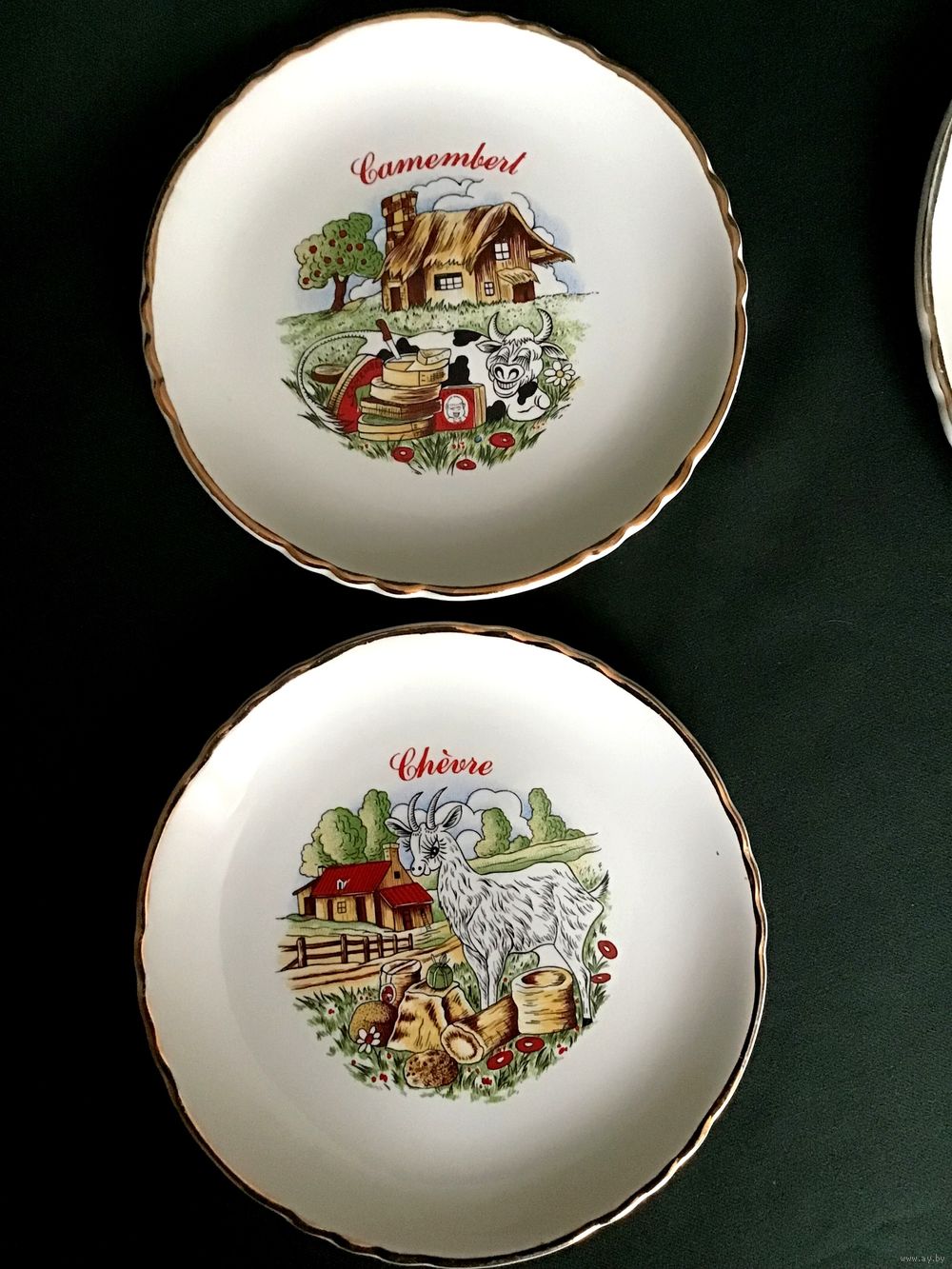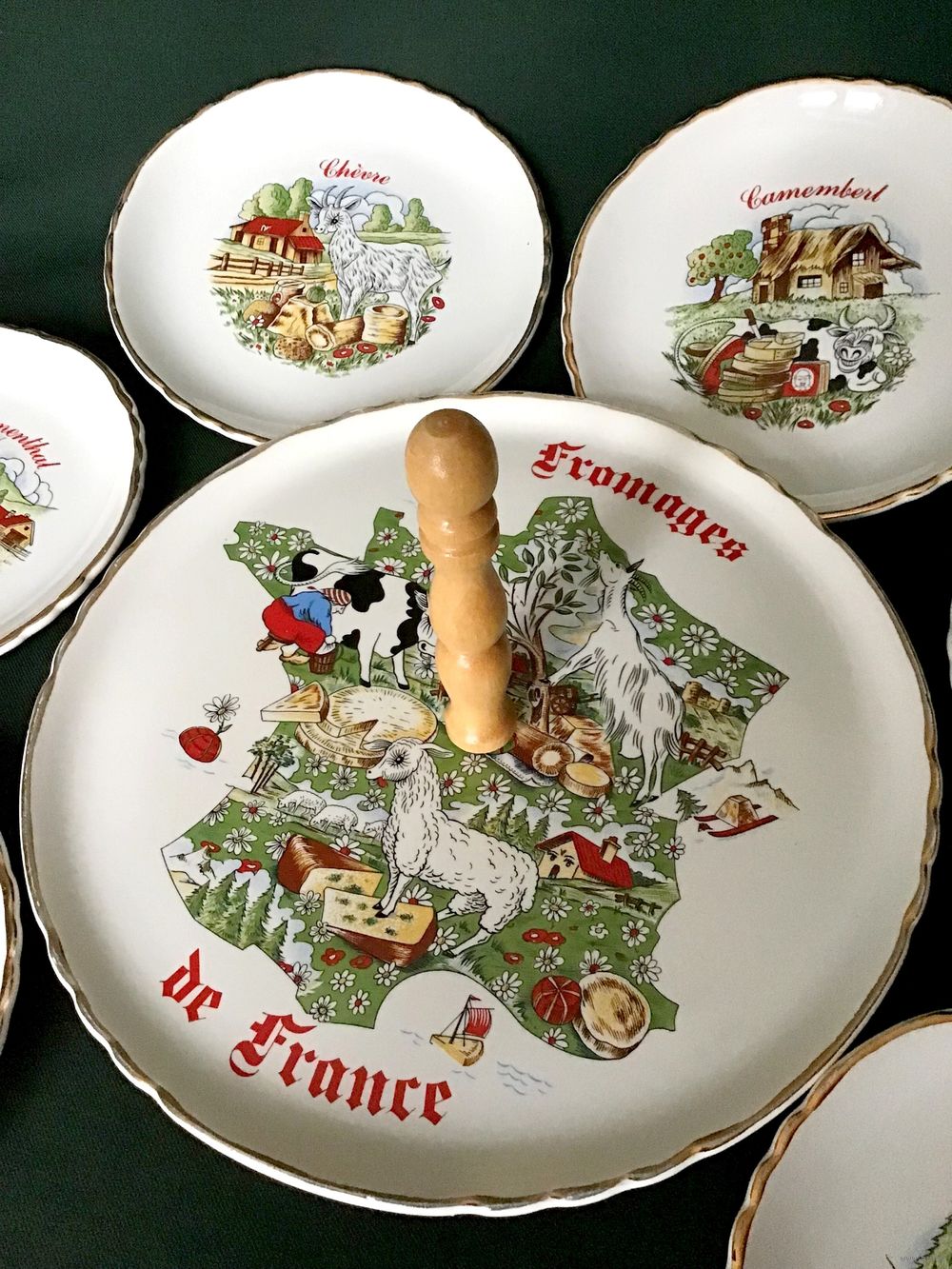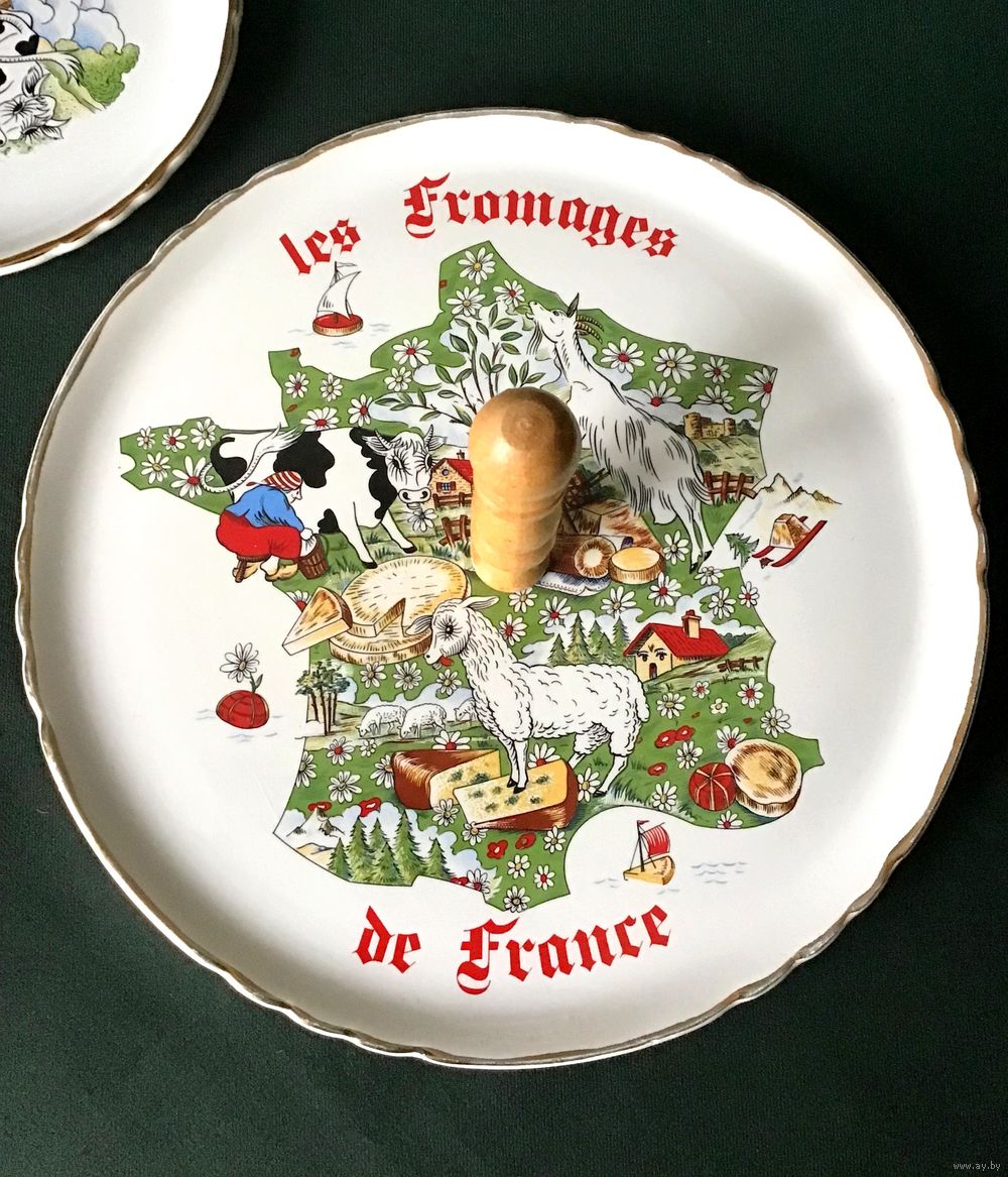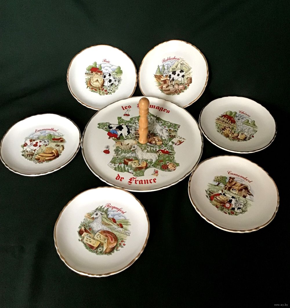 Блюдо 24 см, блюдо-сухарница 30 см, чайник 20 см, сахарница 16 см, молочник 11 см.