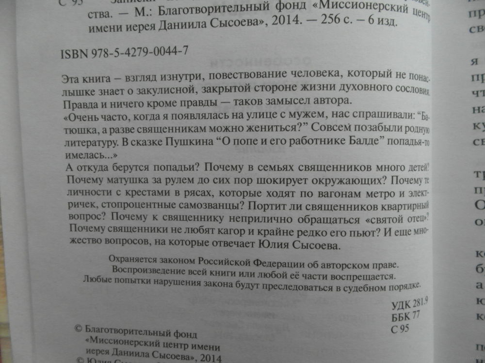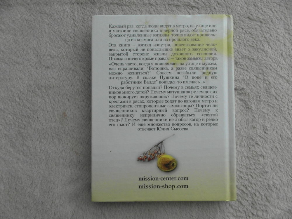 Эта книга - взгляд изнутри, повествование человека, который не понаслышке знает о закулисной, закрытой стороне жизни духовного сословия. Правда и ничего кроме правды - таков замысел автора. `Очень часто, когда я появлялась на улице с мужем, нас спрашивали: `Батюшка, а разве священникам можно жениться?` Совсем позабыли родную литературу. В сказке Пушкина `О попе и его работнике Балде` попадья-то имелась...` А откуда берутся попадьи? Почему в семьях священников много детей? Почему матушка за рулем до сих пор шокирует окружающих? Почему те личности с крестами в рясах, которые ходят по вагонам метро и электричек, стопроцентные самозванцы? Портит ли священников квартирный вопрос? Почему к священнику неприлично обращаться `святой отец`? Почему священники не любят кагор и крайне редко его пьют? И еще множество вопросов, на которые отвечает Юлия Сысоева.