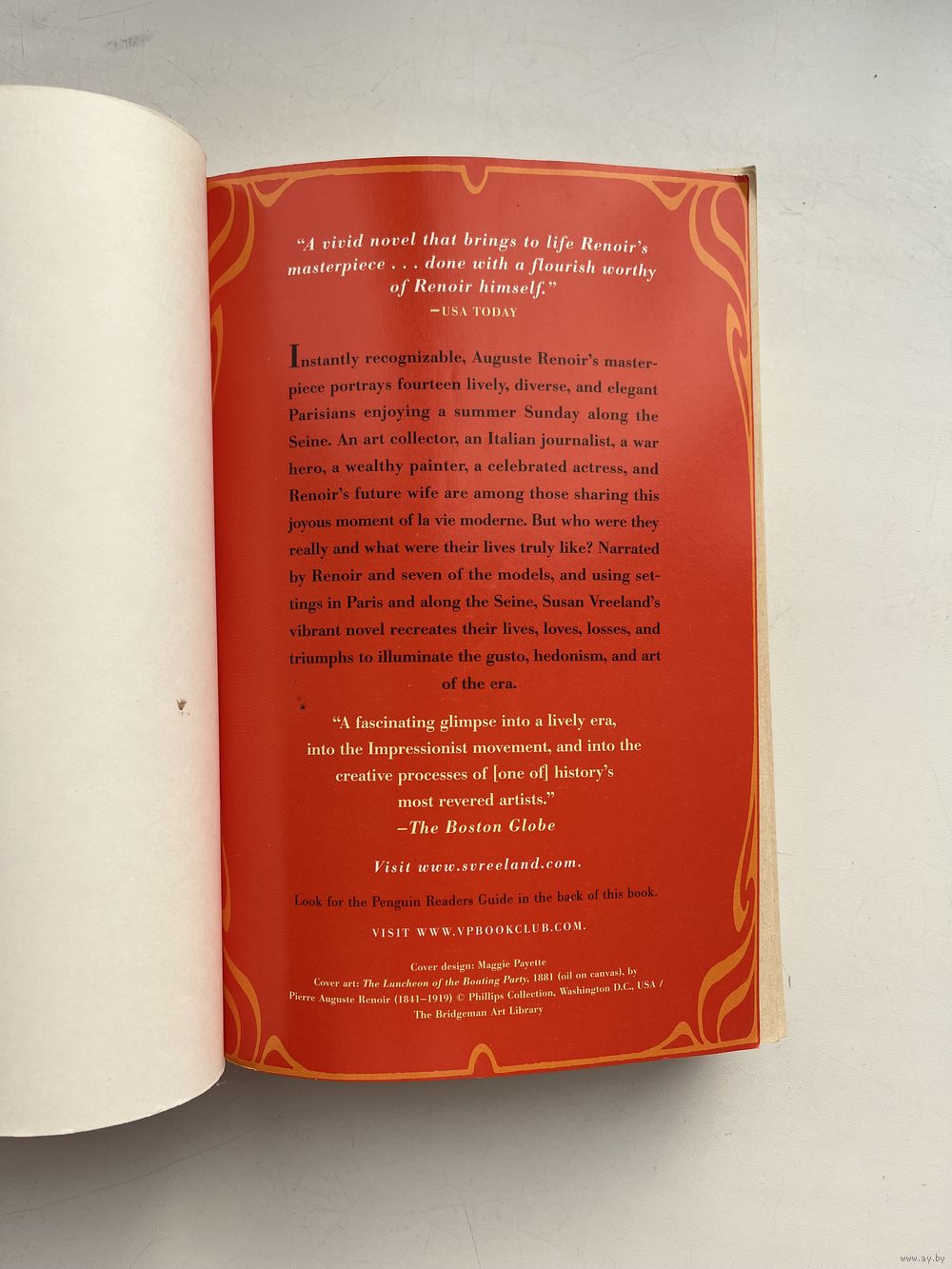 Исторический роман, вдохновлённый знаменитой картиной Пьера-Огюста Ренуара «Завтрак гребцов» (1880–1881). Действие разворачивается в Париже 1880-х годов на террасе ресторана Maison Fournaise у Сены, где Ренуар пишет свой шедевр, изображая друзей и знакомых. В центре сюжета — борьба художника с личными и творческими кризисами, разногласия внутри круга импрессионистов, а также истории моделей: дочери владельца ресторана Альфонсины, будущей жены Ренуара Алины Шариго, богатого художника Гюстава Кайботта и других. Автор мастерски переплетает судьбы героев, показывая гедонизм, творческий пыл и дух эпохи, а также исследует связь между жизнью и искусством. Роман стал бестселлером New York Times и получил высокие оценки критиков.