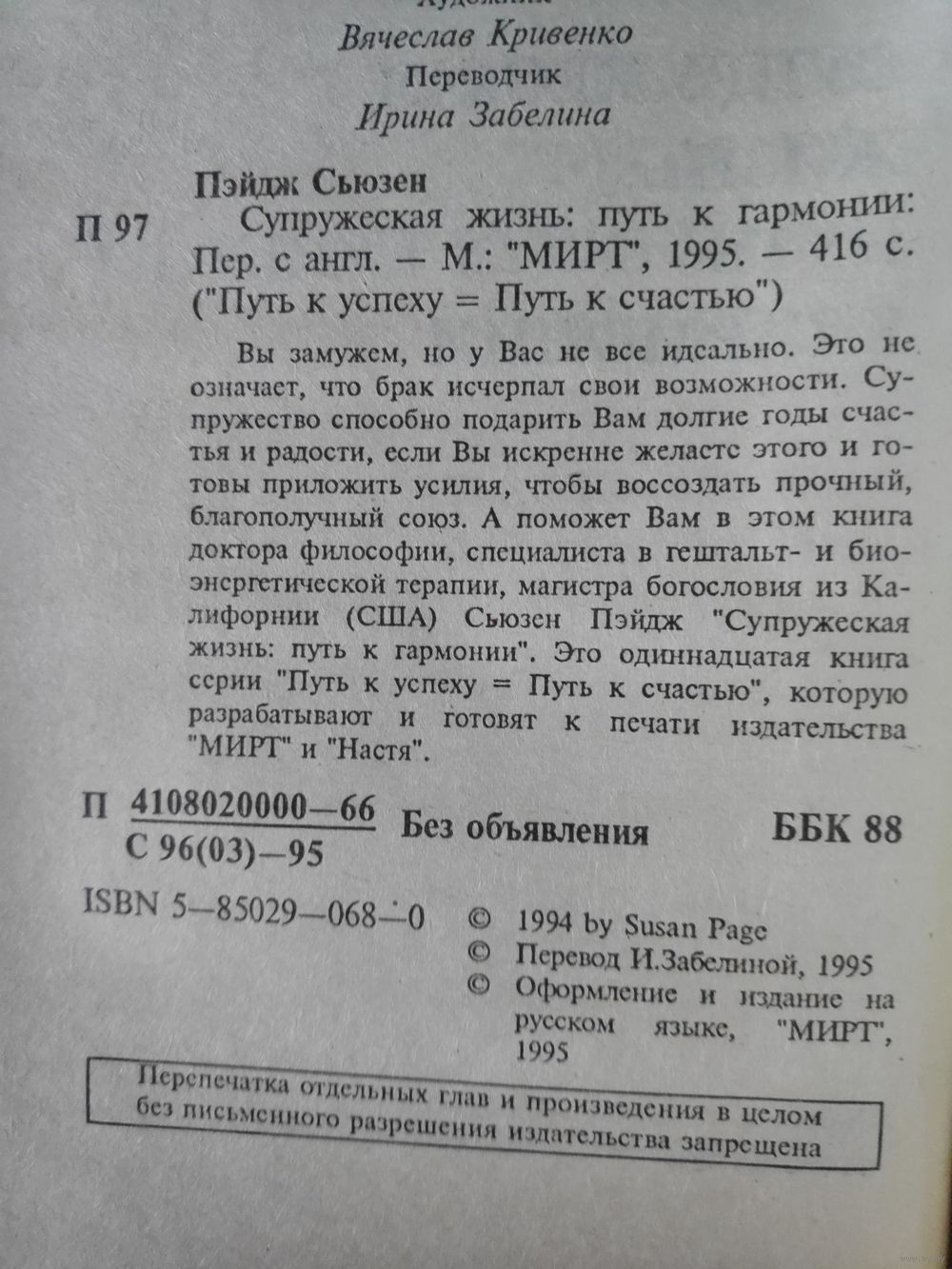 Вы замужем, но у Вас не все идеально. Это не означает, что брак исчерпал свои возможности. Супружество способно подарить Вам долгие годы счастья и радости, если Вы искренне желаете этого и готовы приложить усилия, чтобы воссоздать прочный, благополучный союз. А поможет Вам в этом книга доктора философии, специалиста в гештальт- и биоэнергетической терапии, магистра богословия из Калифорнии (США) Сьюзен Пэйдж "Супружеская жизнь: путь к гармонии". Это одиннадцатая книга серии "Путь к успеху = Путь к счастью", которую разрабатывают и готовят к печати издательства "МИРТ" и "Настя".