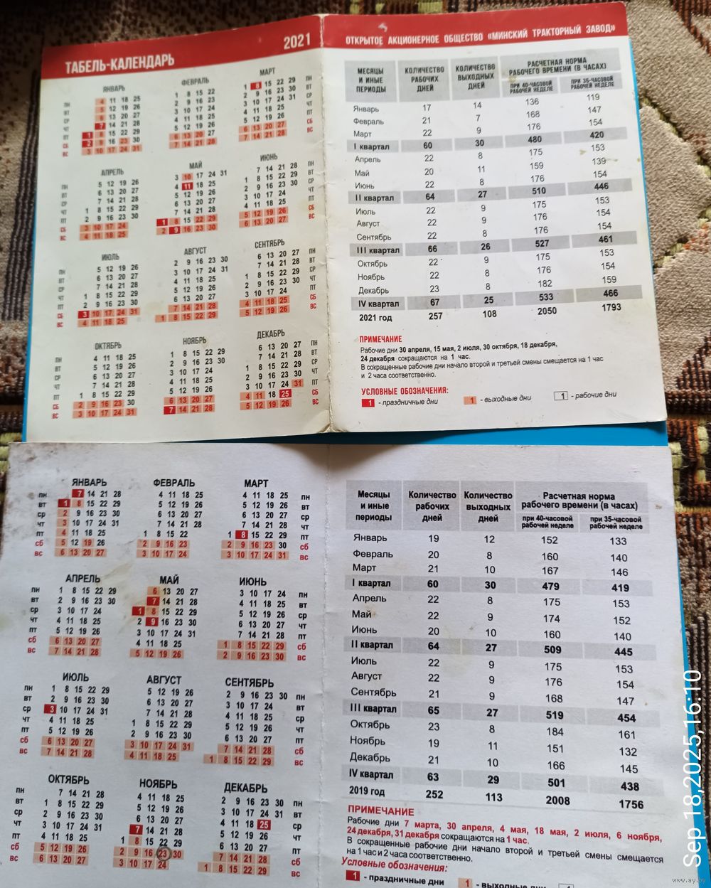 Табель-календарь МТЗ за 2019 и 2021г.г.