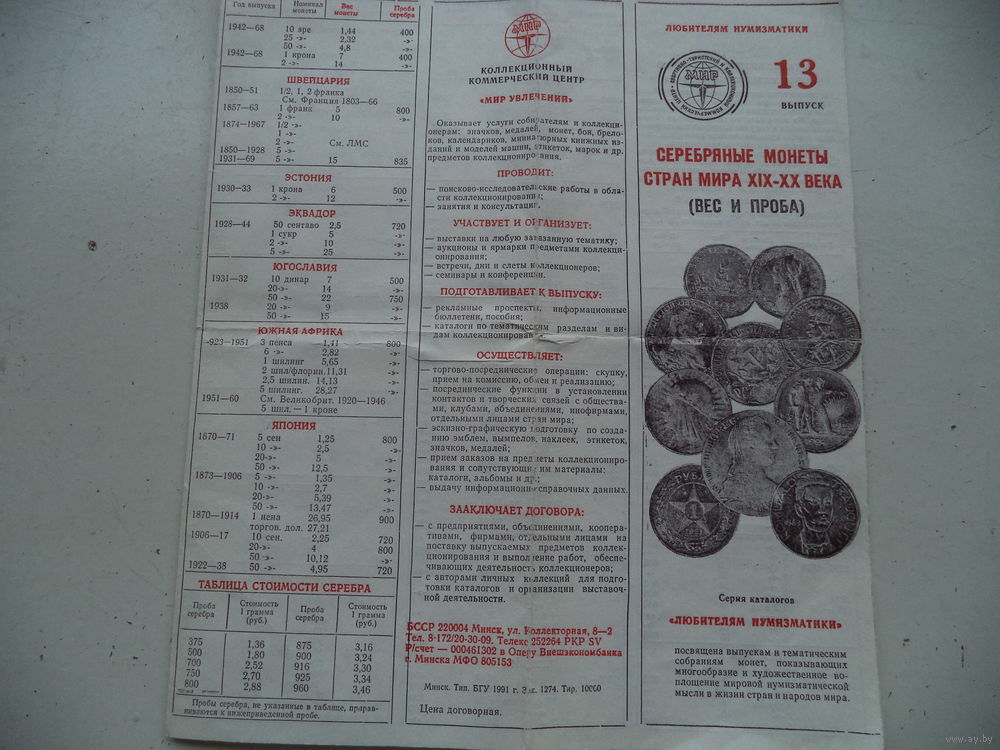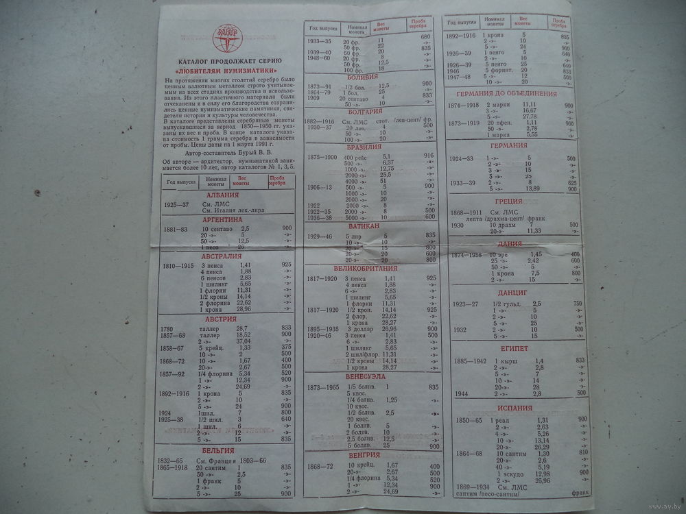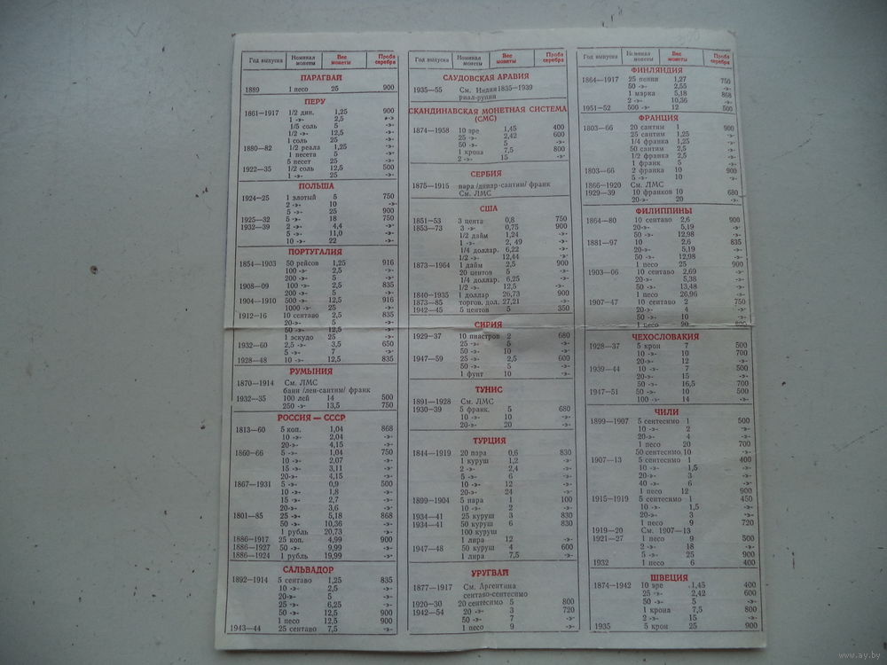 Таблица " Серебряные монеты стран мира ХIХ-ХХ века. (Вес и проба). 1991 г.