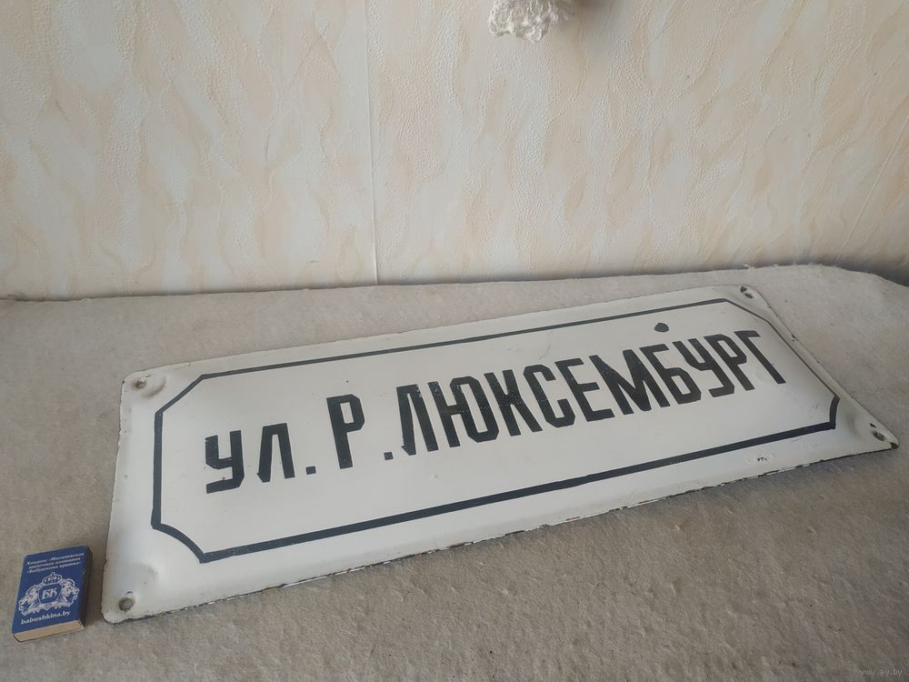 Табличка адресная, уличная шильда, шильда адресная, табличка с названием улицы "ул. Р. Люксембург", огромных размеров, белая. СССР, вторая половина прошлого века.