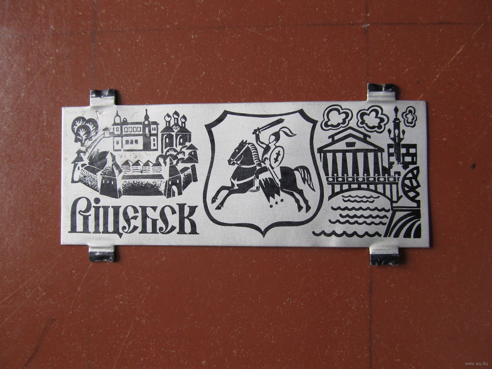 Табличка от настенного светильника-бра выпущенного в 70-х годах прошлого века к 1000-летию г. Витебск на местном заводе электроизмерительных приборов. Данный светильник и эта табличка на нём были замечены внимательными зрителями в 1-ой серии популярного сериала "Слово пацана".Размер: 4х10 см (без фиксирущих выступов).