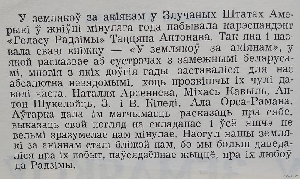Таццяна Антонава. У землякоў за акіянам: аб сустрэчах з замежнымі беларусамі: Н. Арсенневай, М. Кавылём, А. Шукелойцем, З. і В. Кіпелямі, А. Орса-Рамана. Мінск : Голас Радзімы. 1992 г. 111 с. Мяккая вокладка. Кішэнны фармат.