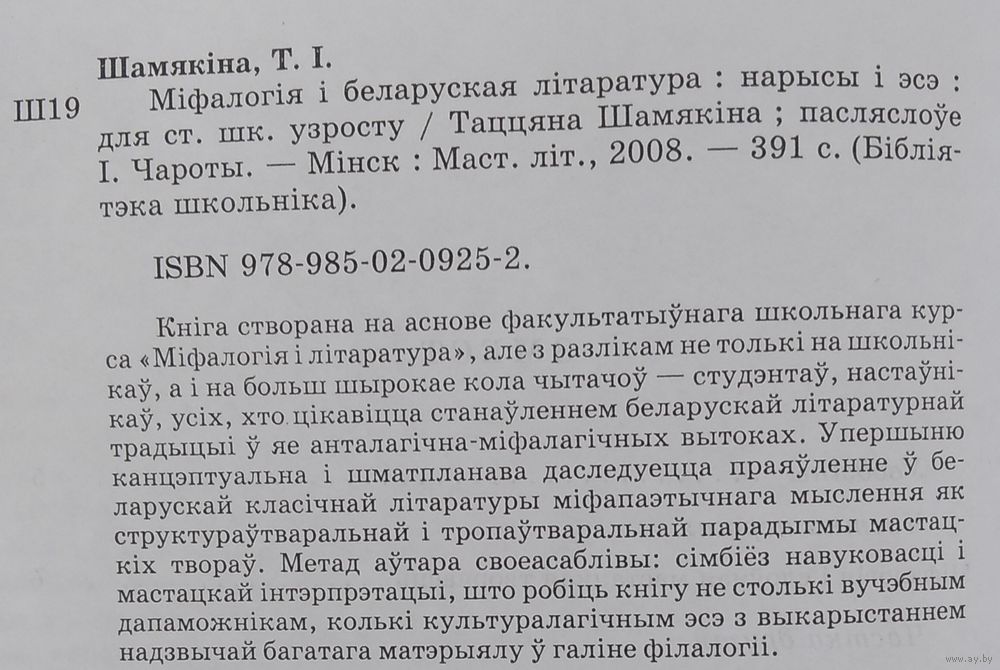 Таццяна Шамякіна. Міфалогія і беларуская літаратура: нарысы і эсэ: Серыя: Бібліятэка школьніка. Мінск : Мастацкая літаратура, 2008 г.389 c. Цверды пераплет.