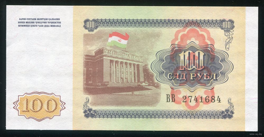 Таджикистан 100 рублей 1994 г. P6. Серия ВВ. UNC