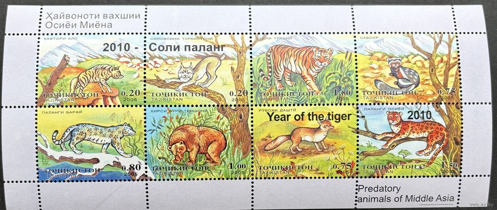 Таджикистан 2010 . Фауна. Животные . Блок с надпечаткой Год тигра на блоке 2005 года