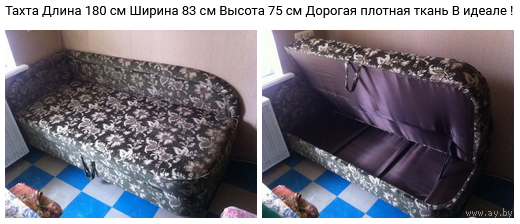 ТАХТА - Дл - 180 см , Ш - 83 см , Выс - 75 см , дорогая плотная ткань . Не используется , стоит в накрытом состоянии + 3 шт спинки-подушки от дивана . САМОВЫВОЗ - г. Борисов , 1этаж , в любое удобное для Вас время дня .