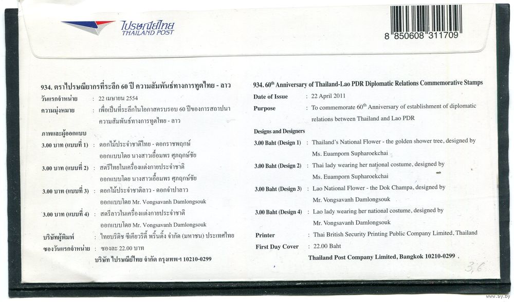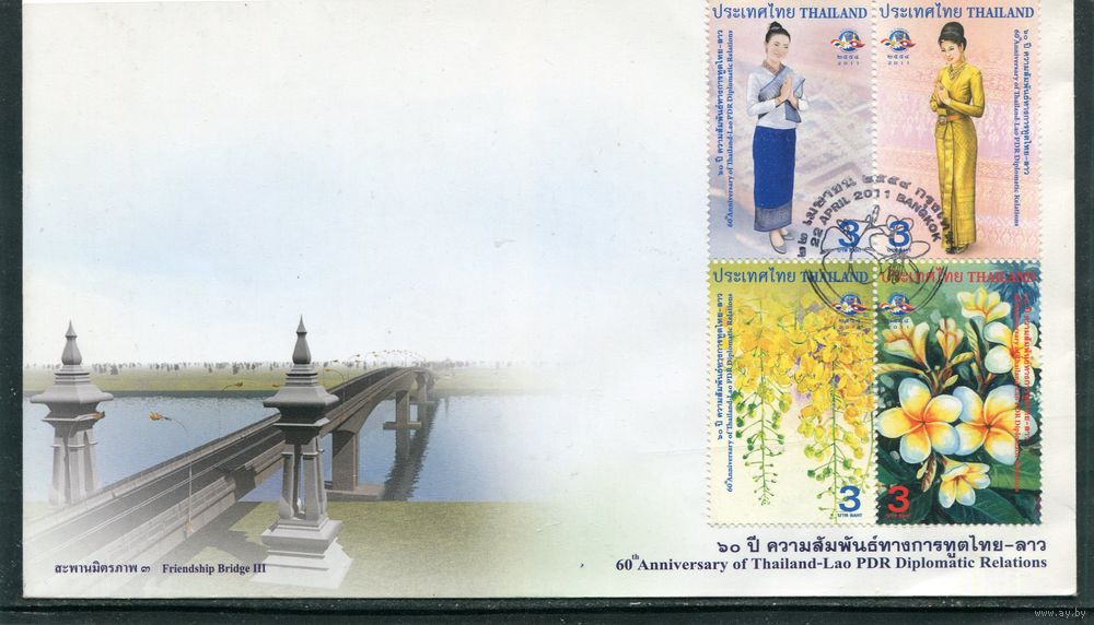 Таиланд. КПД. Конверт с СГ. 60 лет дипломатических отношений с Лаосом. Гашение 2011