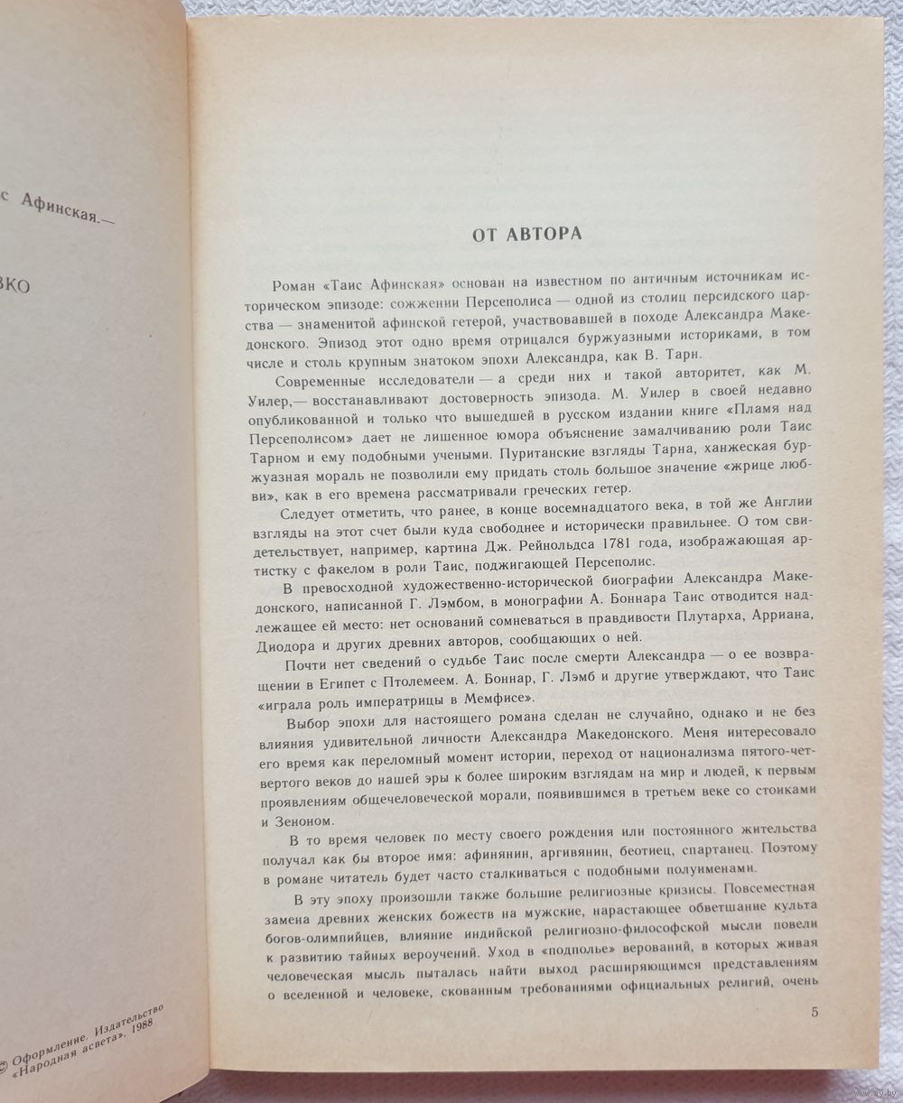 Роман "Таис Афинская" основан на известном по античным источникам историческом эпизоде: сожжении Персеполиса - одной из столиц персидского царства - знаменитой афинской гетерой, участвовавшей в походе Александра Македонского. Это последнее произведение Ивана Антоновича Ефремова освещает один из переломных моментов истории - переход от национализма V-IV вв. до нашей эры к более широким взглядам на мир и людей, происшедший под влиянием войн Александра Македонского.