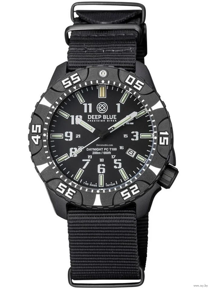 Компания Deep Blue известная, прежде всего своими дайверами, решила вступить на «военную территорию» ранее «оккупированную» такими производителями как Armourlite, Luminox, Marathon и Traser, представила и свою версию милитари часов выполненных в пластиковом (поликарбонатном) корпусе. Конечно же, все модели коллекции Daynight Diver PC Tritium 44 мм Automatic оснащены тритиевой подсветкой T-100.