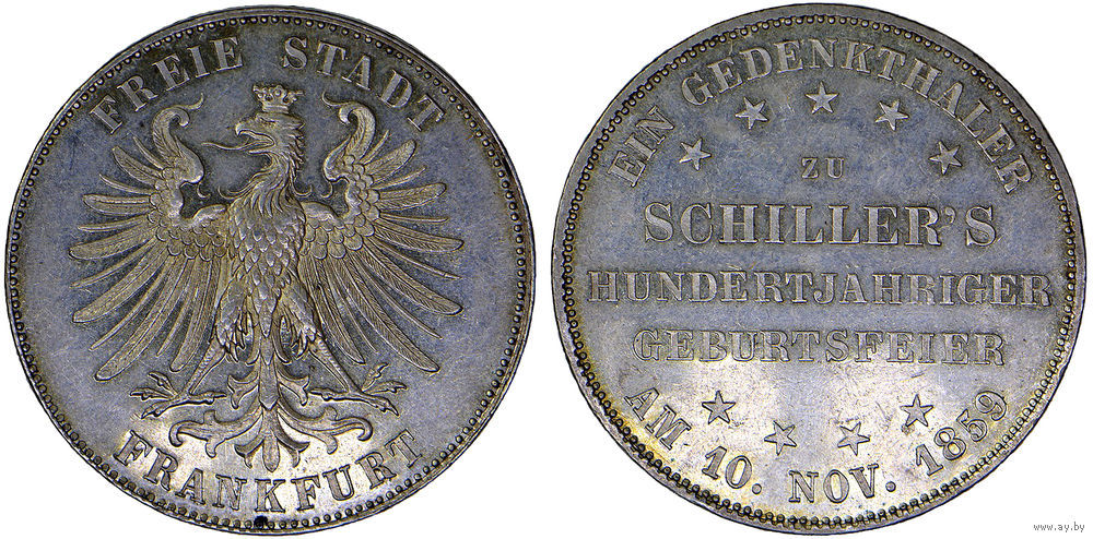 Талер 1859 г. 100 лет со дня рождения Фридриха Шиллера. Вольный город Франкфурт (1807 - 1866). Отличное коллекционное состояние, зеркальные поля, штемпельный блеск. Редкий. Краузе КМ# 992