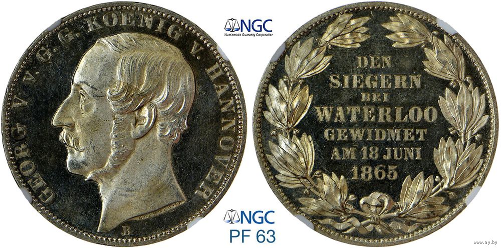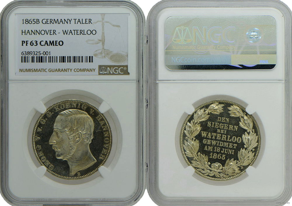 талер 1865 г. B. Георг V. 50 лет битве при Ватерлоо. Ганновер. Германия. Максимальный грейд -TOP POP! NGC PF 63. Серебро. Редкий талер в состоянии Пруф. Монета в слабе NGC, сохранность PF 63. Краузе #241.