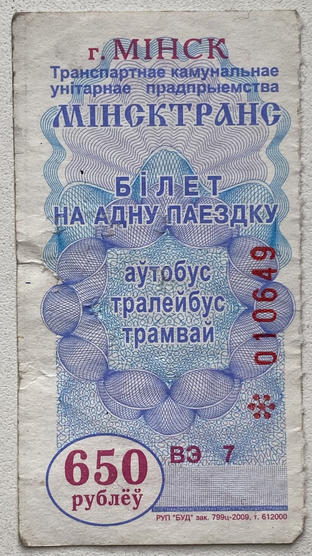 Талон (билет) на проезд автобус, тролейбус, трамвай г. Минск 2009 г. Номинал 650 руб. Серия ВЭ