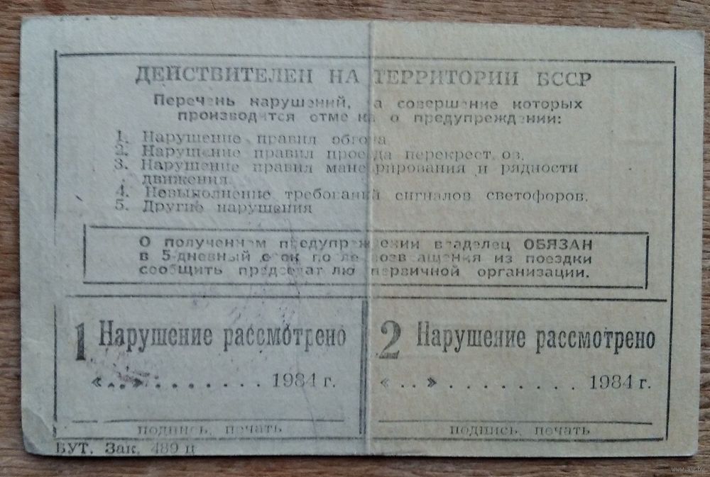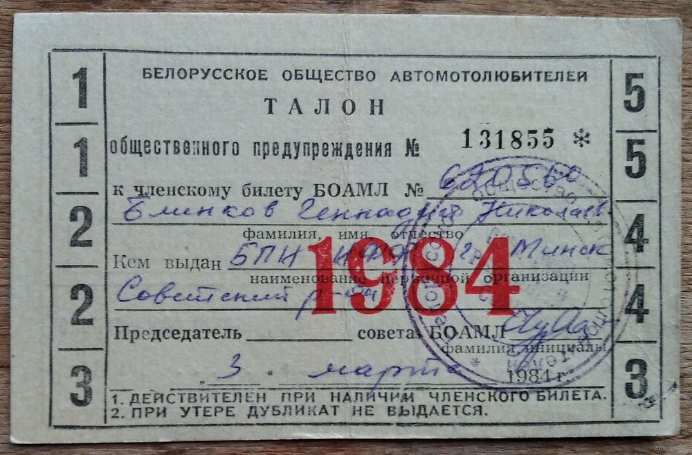 Талон общественного предупреждения. Белорусское общество автомотолюбителей. 1984 г.